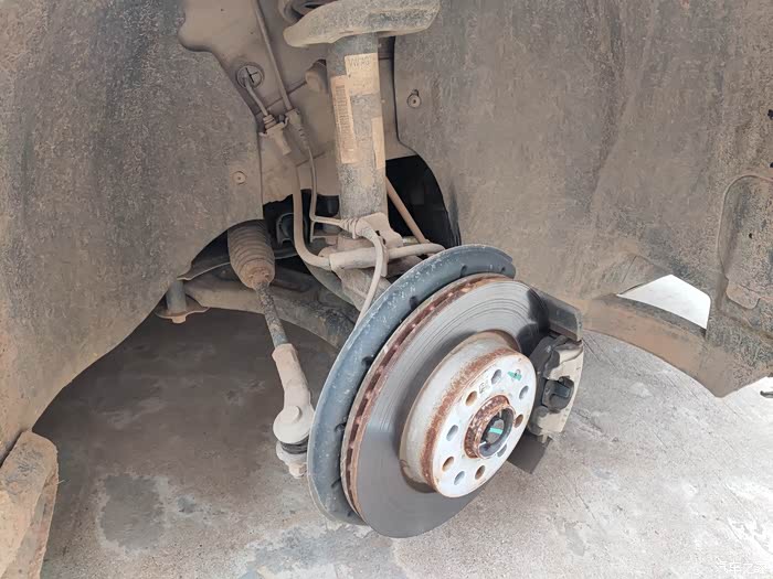 2/拆轮胎,先把轮胎五个螺铨拧松不能完全拧掉,接着把千斤顶放在前轮后面的顶升位置(车底主梁上)。一定记得把车轮顶到悬空,这时候减震有一定行程,要往上升蛮多,不然轮胎螺铨拆完后车子会把轮胎崩出来,我就吃了这个亏。拆完后就是下面的样子了,把轮胎放在车底,防止千斤顶失效。