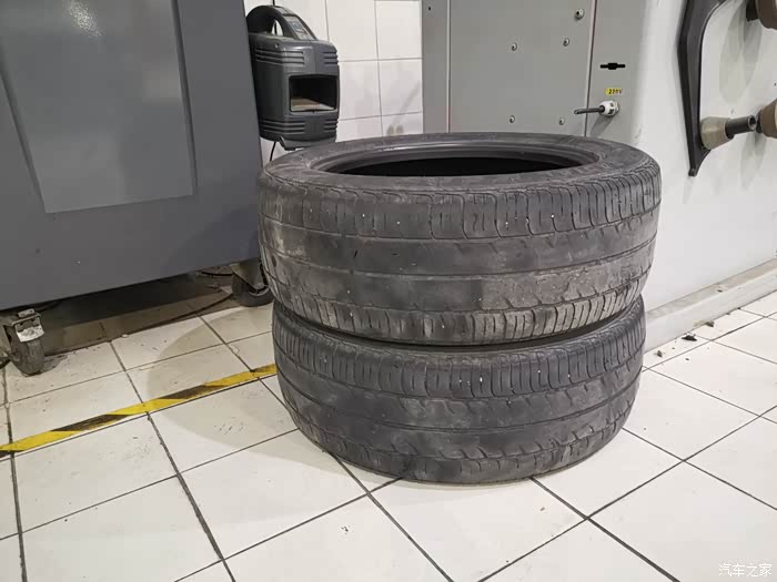 老师直接把两个新换上去的轮胎安装到了前面,原来的两个前轮安装到后轮,不知道为什么,我也没有问,反正感觉这样操作是对的