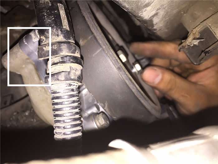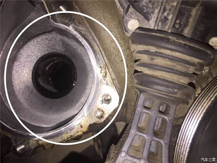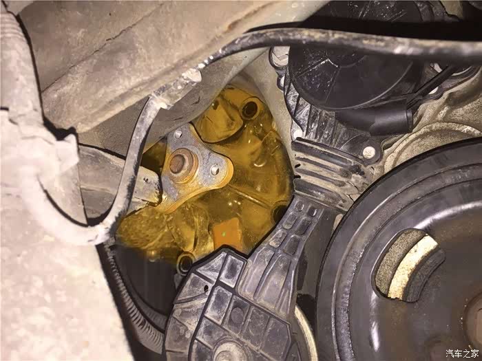 终于见到水泵真身了,这个位置相对来说还是很容易的,不过这是将发动机沉下来之后看到的,如果不将发动机的机脚拆掉,也只能是用眼睛看看罢了,就是眼前的这个水泵漏水了。