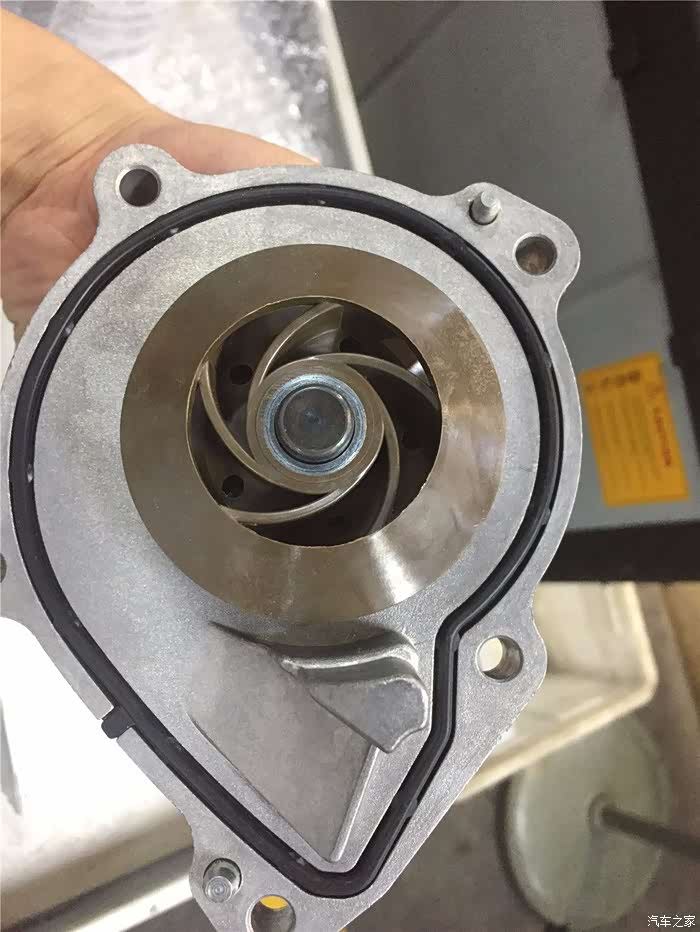 水泵的里面特写,这个密封圈我一会儿在安装的时候还会进行涂胶作业,这里就是防冻液水流动力的发源地,它一旦坏掉了,整个水循环系统也就挂掉了,由于水泵机械的影响链接,导致它没法进行实时的控制开关的控制水流的大小,所以在现在B系列发动机上面采用了电子的水泵进行更加精准的控制,但是就是耐用度差了点,故障率较高。