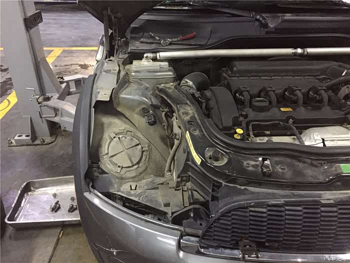 R56的车身和发动机由于独特的造型,所以必须将右前大灯也一并拆卸掉,才能将机脚拿出来。为什么要把机脚拿掉呢,因为要将发动机向下沉下来,才能用手摸到水泵轮的三条锁紧螺栓。听起来是不是有点复杂,不过没关系,跟着我的思路和图片走,你会看明白是怎么将水泵更换掉的。