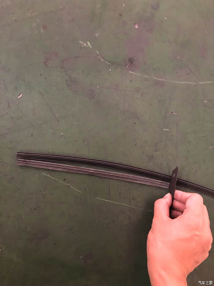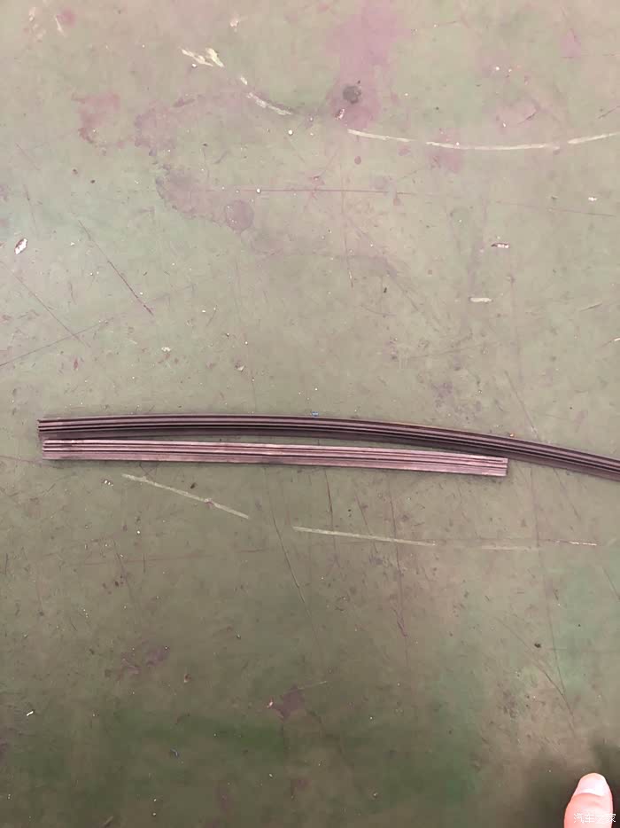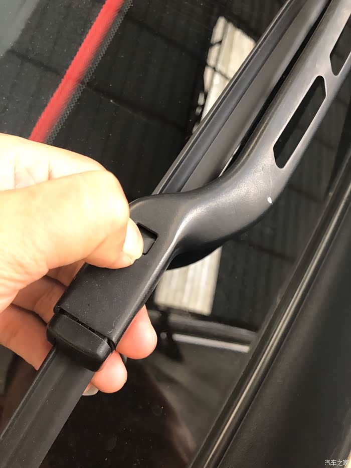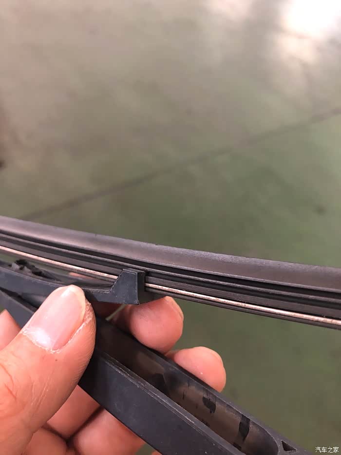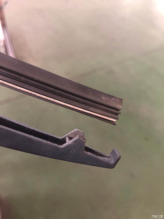 后雨刮胶条是用两条不锈钢片卡在扣子里的。(胶条底部凹槽一边一条)