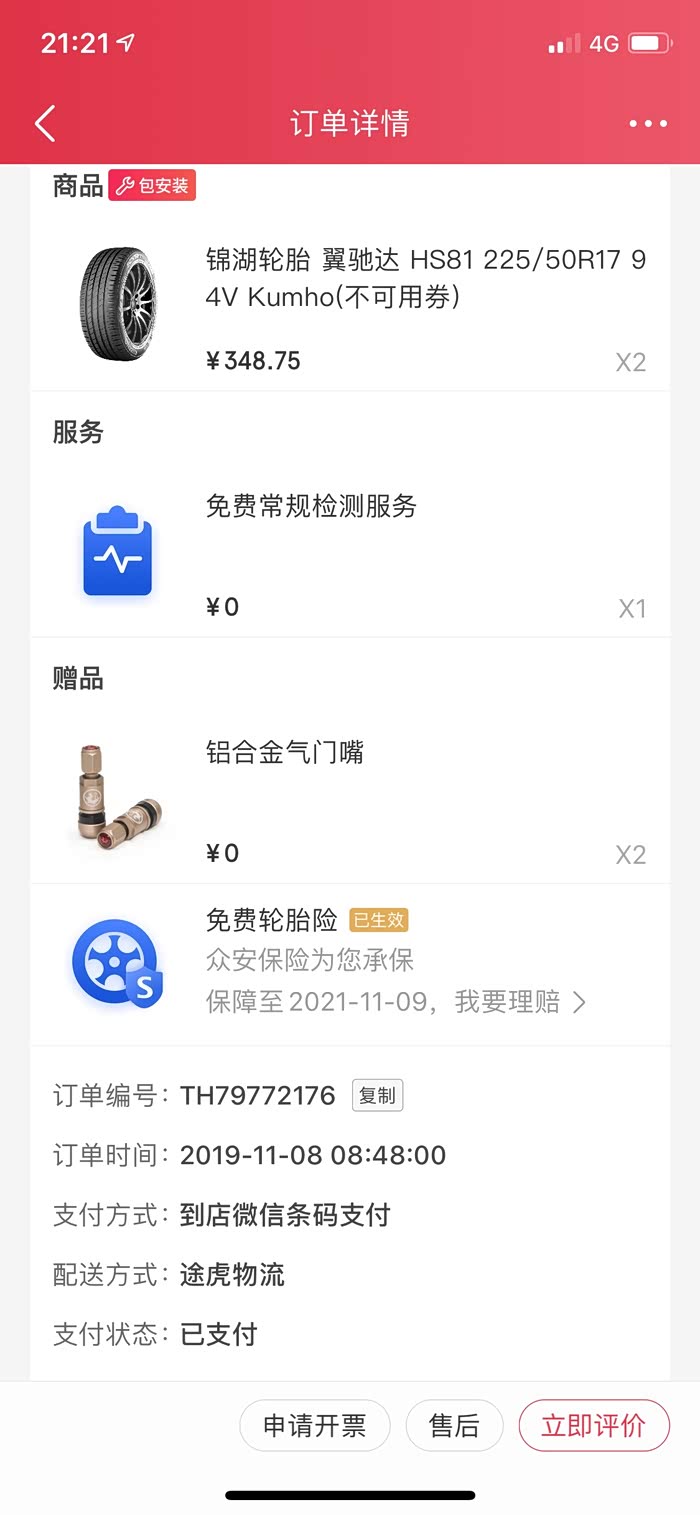 从某虎上买两条和原厂一模一样的轮胎进行更换,包安装和调动平衡。
