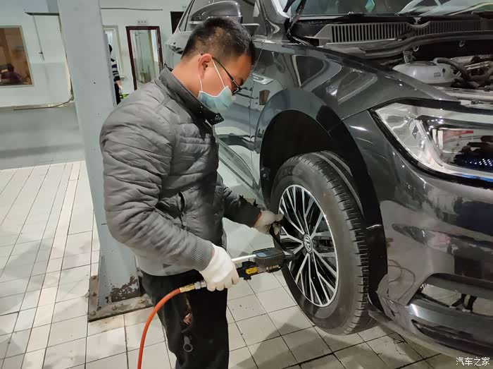 师傅给4个轮胎测胎压,打气