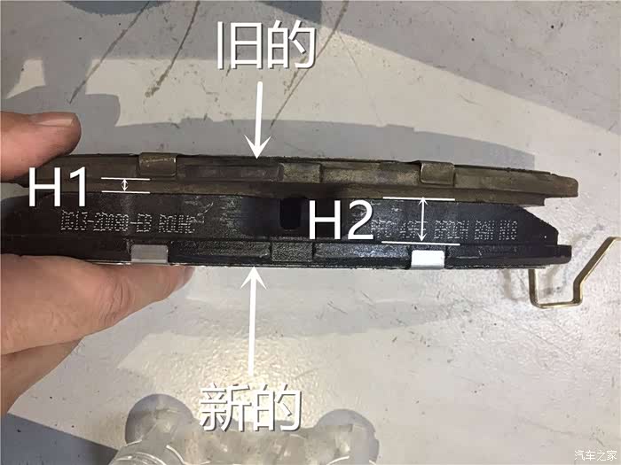 新旧刹车片的对比,H1是旧刹车片的厚度,H2是新刹车片的厚度。这个角度还是很直观的吧,厚度的多少一眼明了。
