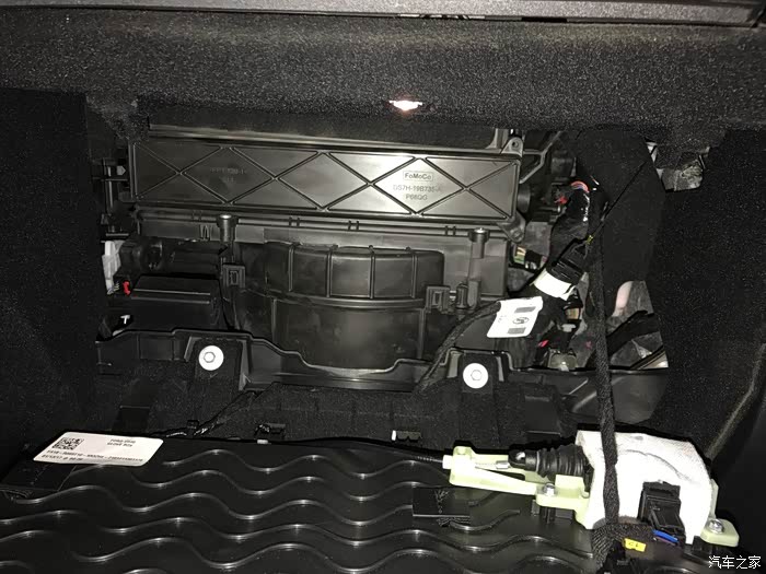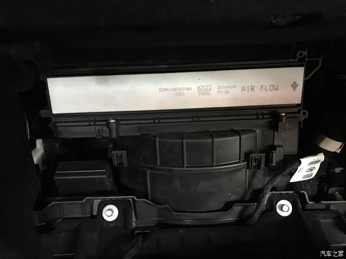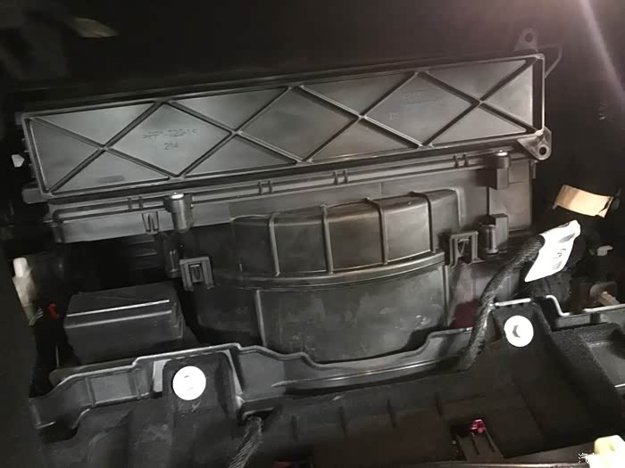 手扶箱完全打开后就看到空调滤芯的挡板了,注意有跟线挂在手扶箱上面不要用力拉断了!!右边有两颗梅花螺丝,我已经拆掉了,所以你们看不到。