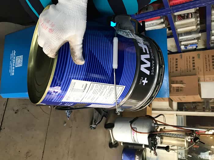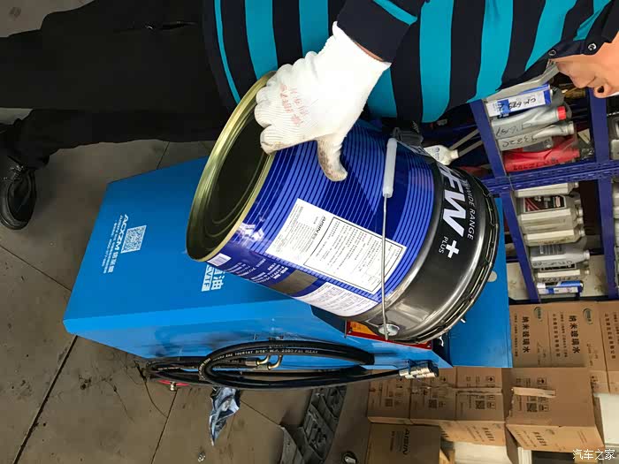 这位是张老板,他亲自上阵,当着我的面打开全新的爱信AFW+变速箱油,然后灌装到更换变速箱油的机器中