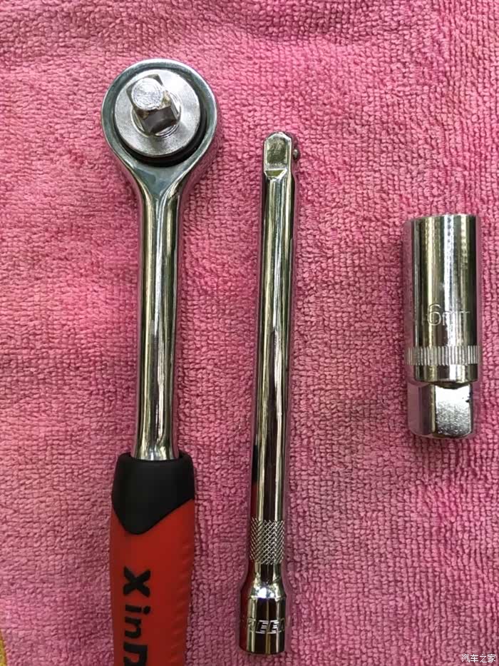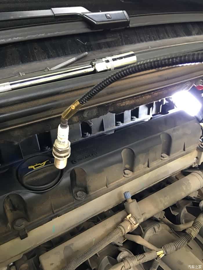 小飞、接杆、16mm套筒再上。空间有限,需要多次拔插扳手和套筒。下火花塞要拧很多圈。