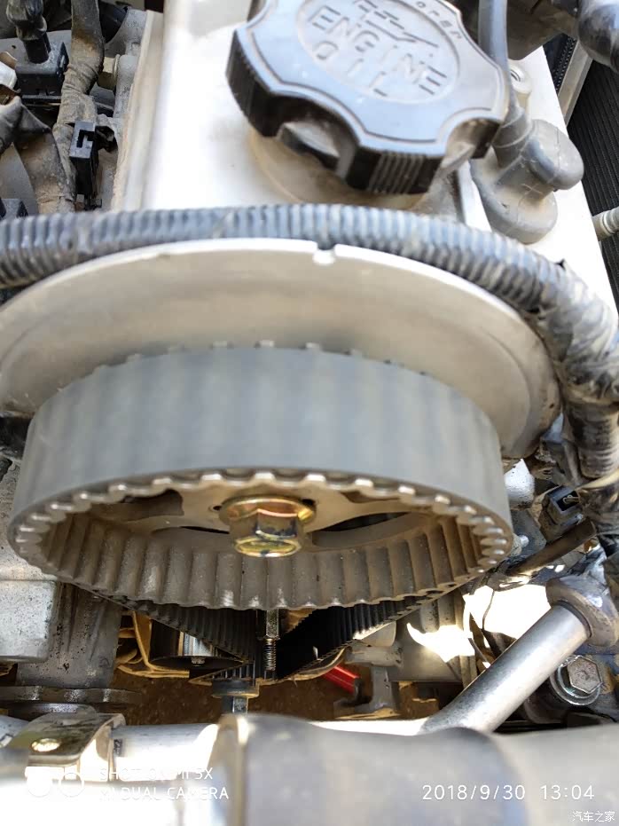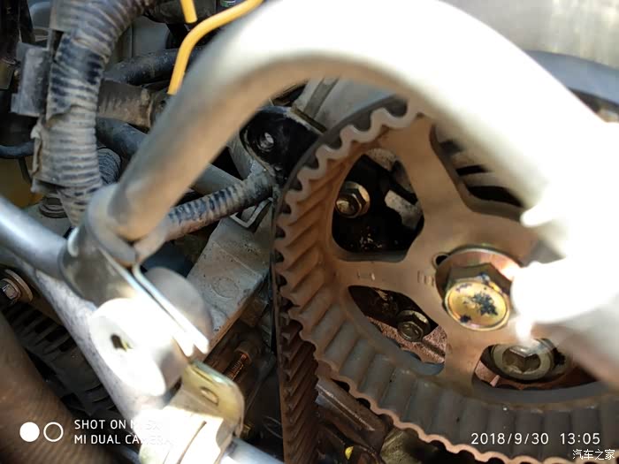 新装的正时带,记住正时带的安装方向,别装反了,先安装涨紧轮再安装正时带,我刚开始是先装正时带再安装涨紧轮,结果弄了很久都没有装上去。