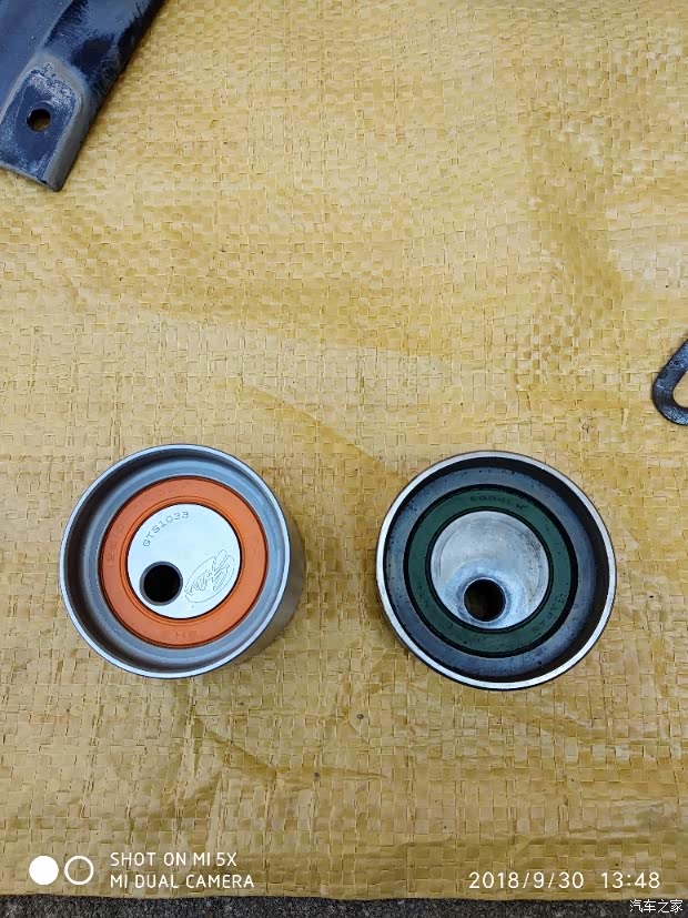 新旧涨紧轮,新的也是盖茨的,和新的对比,旧的有一点间隙,但不影响使用,旧正时带试车时会往外跑出一半左右,新的安装完试车就不会往外跑,走得很正,说明新的涨紧轮和正时带还是配合不错的。