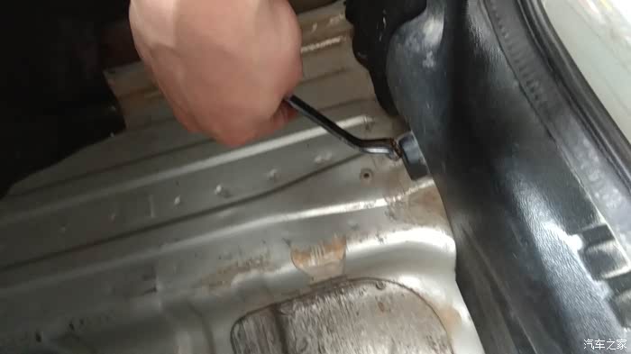 后备箱锁扣装饰板稍稍揭开一点缝就可以看到螺丝,左右各一颗,13mm