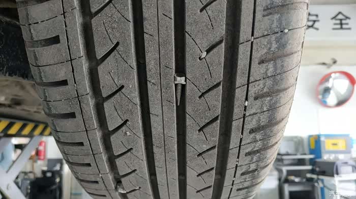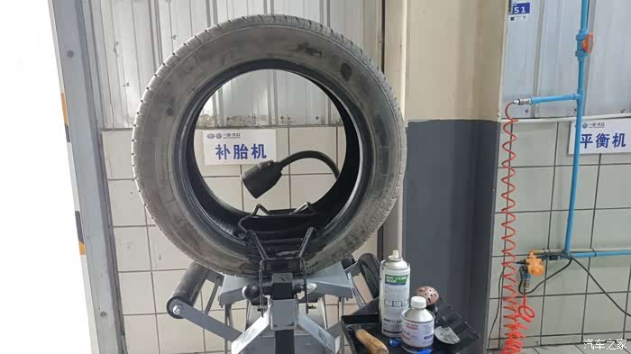果然,两侧的胎压差的有点多,充气的时候发现轮胎被扎了