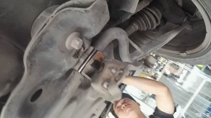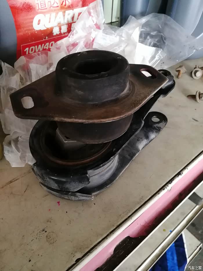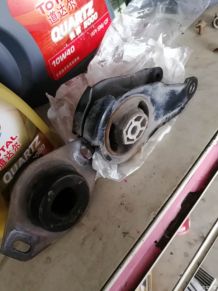 马上满7年了,估计各种橡胶件也老化厉害,之前我有反馈过过减震带有余震,折腾完减震后,此现象仍有。说明是其它问题。咨询过专修,说换前平衡杆的胶套,换了还有,这次把下机脚胶和变速箱吊胶一并换了,上支架那儿检查了还行。