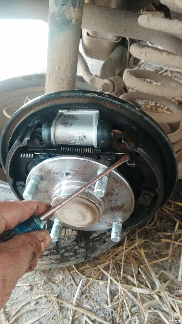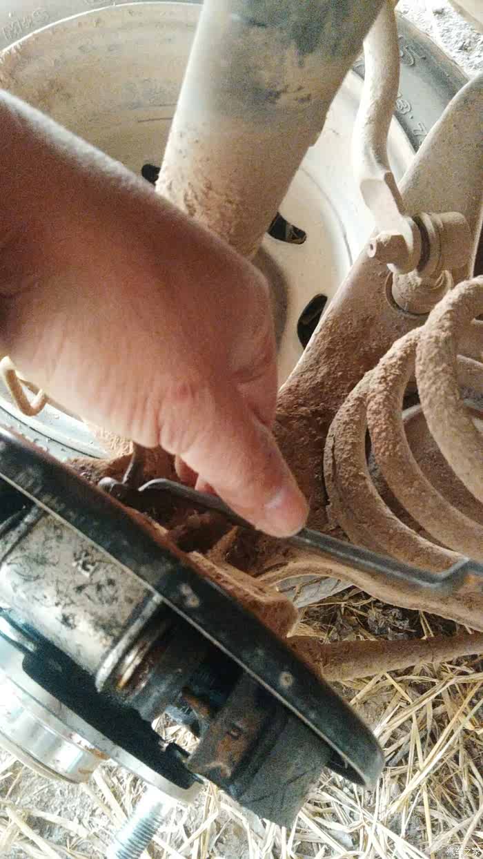 分泵后面用8#梅花板手拧出两根螺丝和用10#开口拧出刹车管。这样就可以拿出分泵出来了??