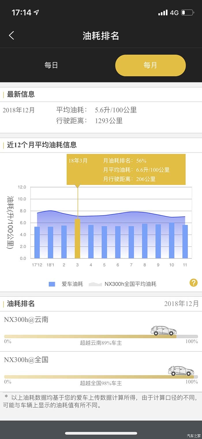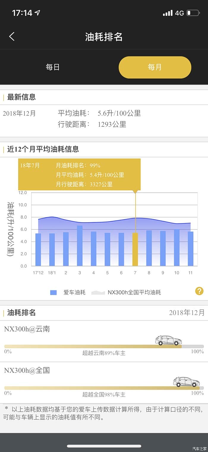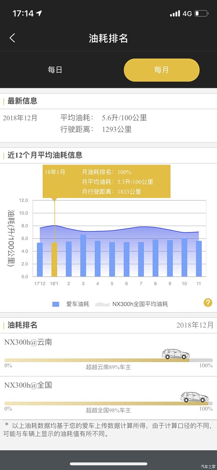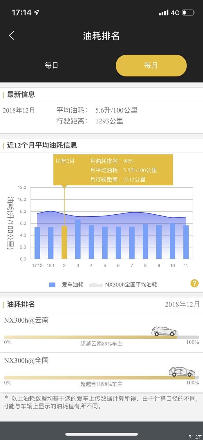 本来楼主上个月就想写这个帖子,无奈自己平时屁事儿太多(其实就是懒)。楼主生活在我国老少边穷地区的昆明市,没错,就是那个下班就去捡孔雀蛋,睡觉盖芭蕉叶,4号菜市场秤斤卖的神奇地方。17年12月提车NX300H锋行版(不要问我为什么不买锋致版谢谢),到18年12月刚好一年。每天通勤来回有45公里(30公里高架桥,15公里城市路),不用好奇为啥不骑大象上班,现在年年创文创卫,大象已经被限行了。周末节假日经常开车出去打猎啥的,总的来说高速里程估计占了四分之一。城市道路占二分之一,高架桥占了四分之一,下面我贴出完整的12个月油耗和行驶里程记录(均来自官方手机APP自动同步排除人为因素)目前是2万9千多公里,我就约等于3万了(无耻的标题党)。我发现很多车友喜欢刚刚提车就晒油耗,有晒超过陆巡的,有晒低于三蹦子的,不得不说车友中藏龙卧虎人才济济,但真正要获得一个比较有说服力的油耗数据,还真得先开个1,2万公里,去过大城市下过贫困村才能说明自己历经沧桑嘛。好了不废话了说下自己的一点关于这车油耗的浅薄体会,1,此车最省油时速介于40-60之间2,此车18寸轮胎要比17寸高出0.4升/百公里,且提速变慢一丢丢。3,此车(混动都差不多)能够很好的治愈路怒症,文明礼貌多谦让油耗自然就下来了4,充分预估红绿灯时间和尾车离自己的距离,能滑行的绝不踩油门(这是最最关键的省油技巧)5,起步时能量表指针就是最好的优雅指示器6,高速上不要飚太快,110以后油耗涨到8,9个也是很正常的事情(SUV撞风面积巨大NX还算是风阻系数小的了)7,92号油放心加,丰田车不挑食。8,多次测试灯亮还有12升油。