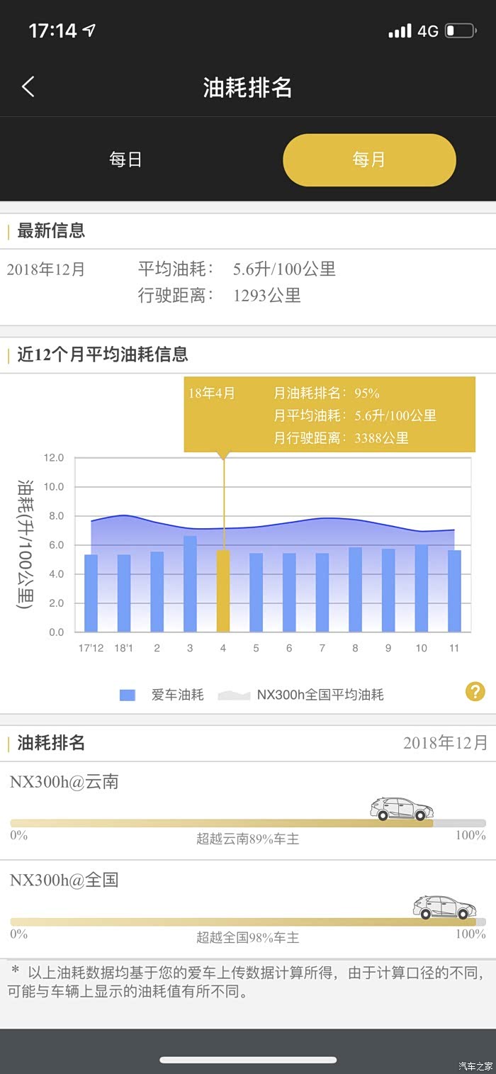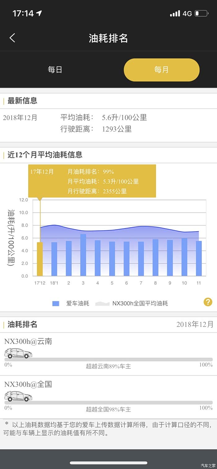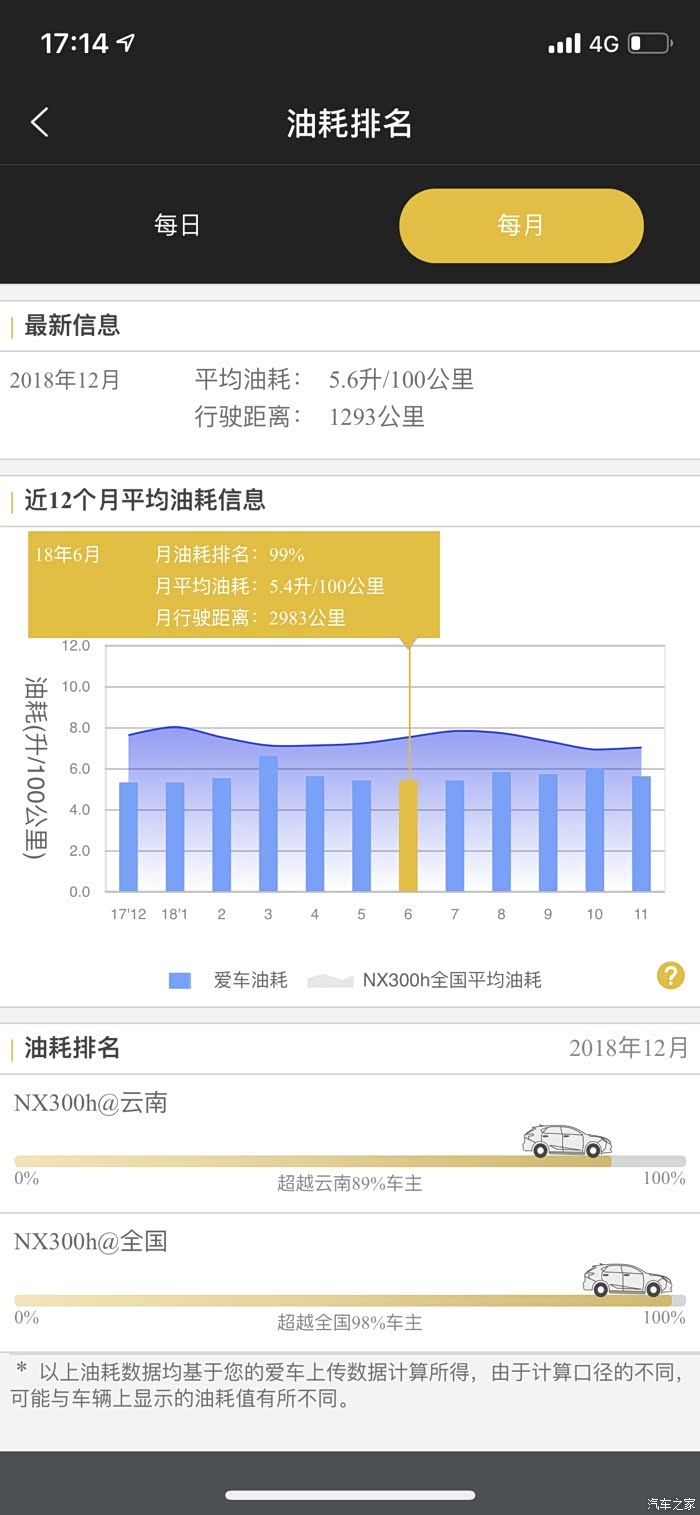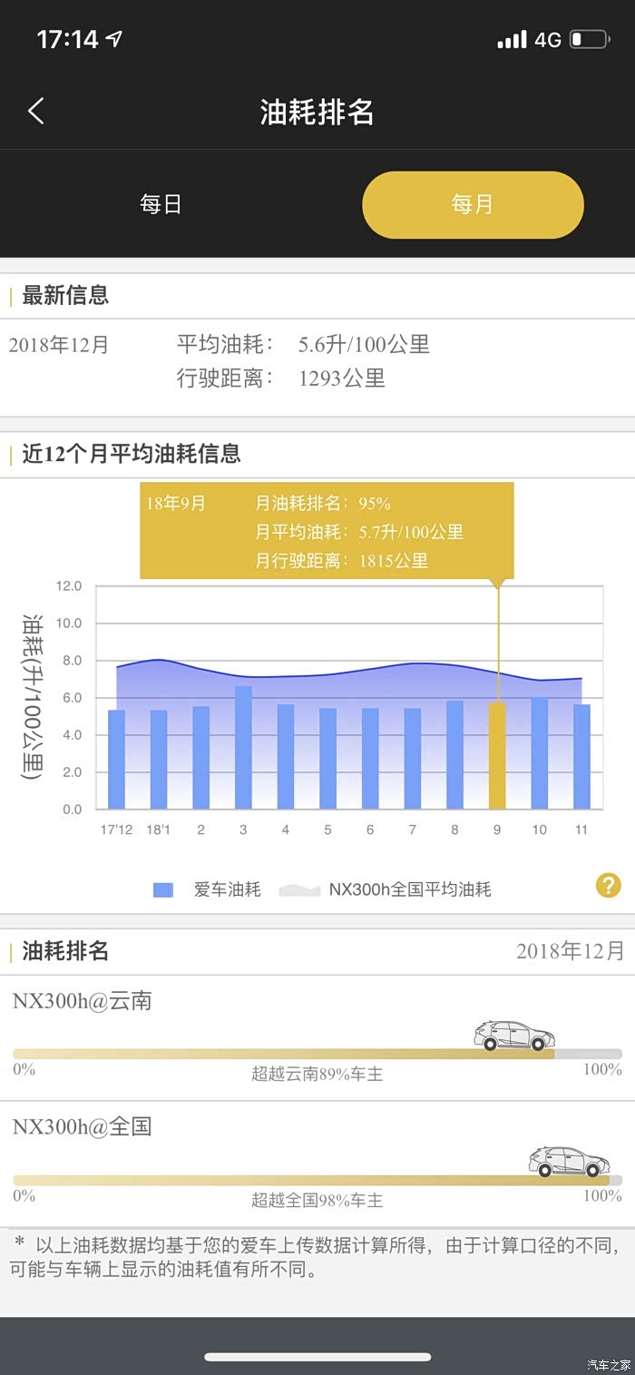 本来楼主上个月就想写这个帖子,无奈自己平时屁事儿太多(其实就是懒)。楼主生活在我国老少边穷地区的昆明市,没错,就是那个下班就去捡孔雀蛋,睡觉盖芭蕉叶,4号菜市场秤斤卖的神奇地方。17年12月提车NX300H锋行版(不要问我为什么不买锋致版谢谢),到18年12月刚好一年。每天通勤来回有45公里(30公里高架桥,15公里城市路),不用好奇为啥不骑大象上班,现在年年创文创卫,大象已经被限行了。周末节假日经常开车出去打猎啥的,总的来说高速里程估计占了四分之一。城市道路占二分之一,高架桥占了四分之一,下面我贴出完整的12个月油耗和行驶里程记录(均来自官方手机APP自动同步排除人为因素)目前是2万9千多公里,我就约等于3万了(无耻的标题党)。我发现很多车友喜欢刚刚提车就晒油耗,有晒超过陆巡的,有晒低于三蹦子的,不得不说车友中藏龙卧虎人才济济,但真正要获得一个比较有说服力的油耗数据,还真得先开个1,2万公里,去过大城市下过贫困村才能说明自己历经沧桑嘛。好了不废话了说下自己的一点关于这车油耗的浅薄体会,1,此车最省油时速介于40-60之间2,此车18寸轮胎要比17寸高出0.4升/百公里,且提速变慢一丢丢。3,此车(混动都差不多)能够很好的治愈路怒症,文明礼貌多谦让油耗自然就下来了4,充分预估红绿灯时间和尾车离自己的距离,能滑行的绝不踩油门(这是最最关键的省油技巧)5,起步时能量表指针就是最好的优雅指示器6,高速上不要飚太快,110以后油耗涨到8,9个也是很正常的事情(SUV撞风面积巨大NX还算是风阻系数小的了)7,92号油放心加,丰田车不挑食。8,多次测试灯亮还有12升油。