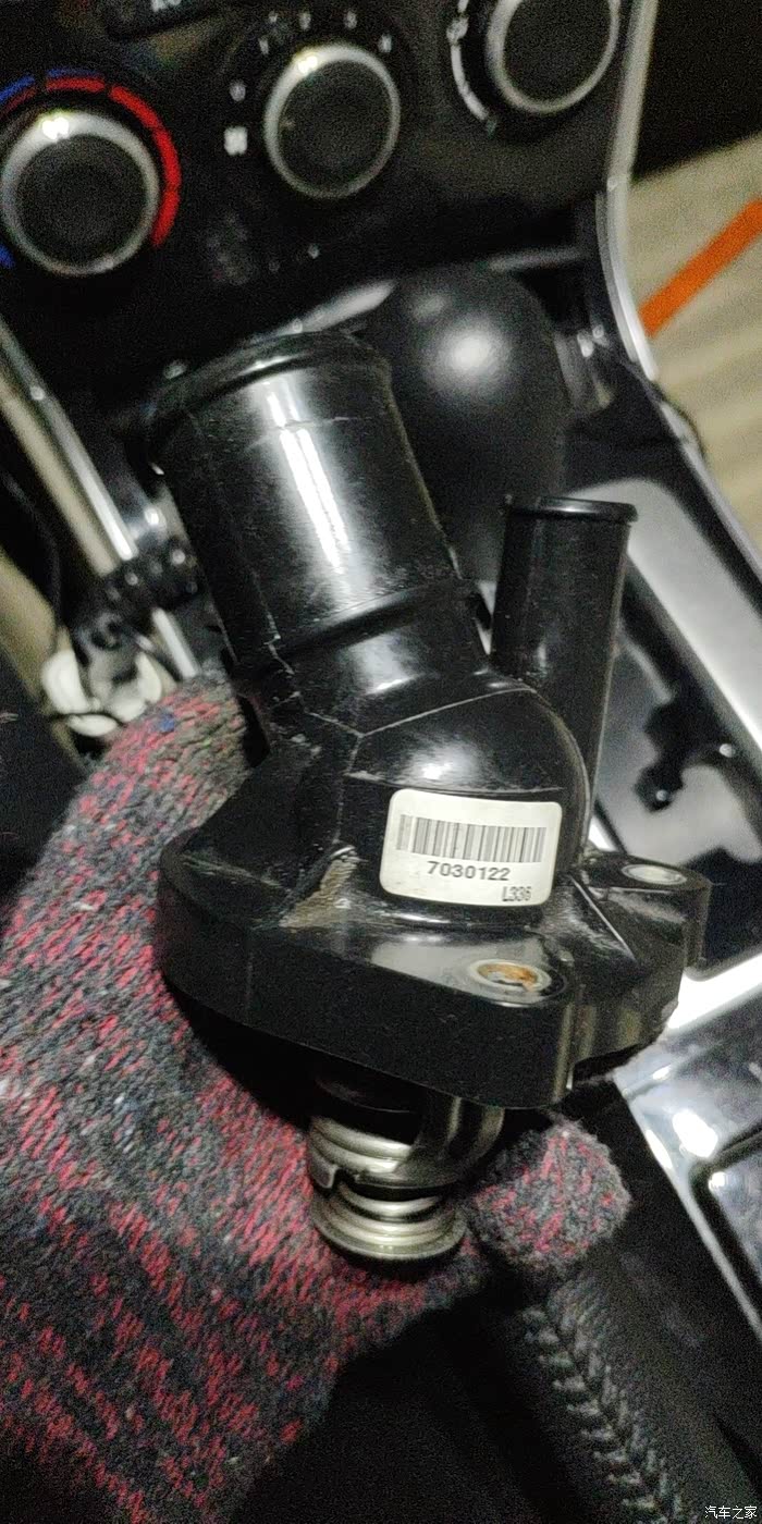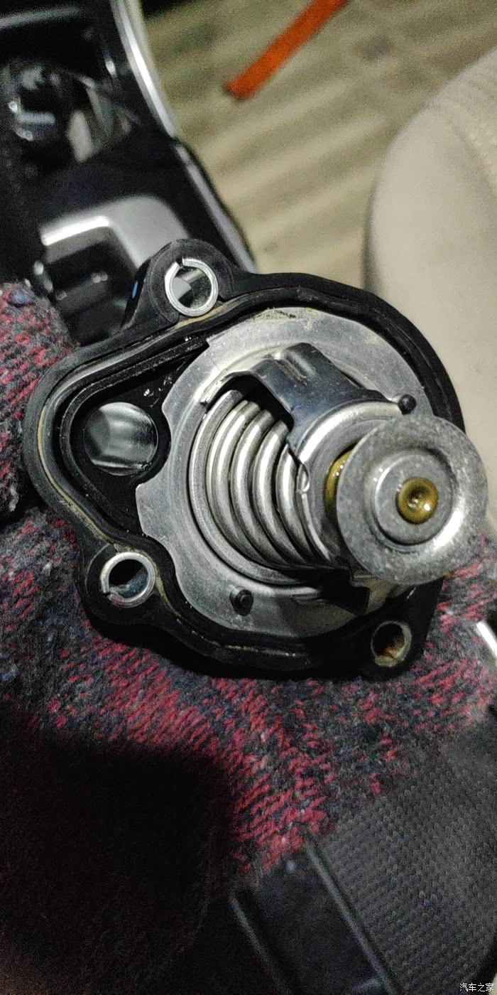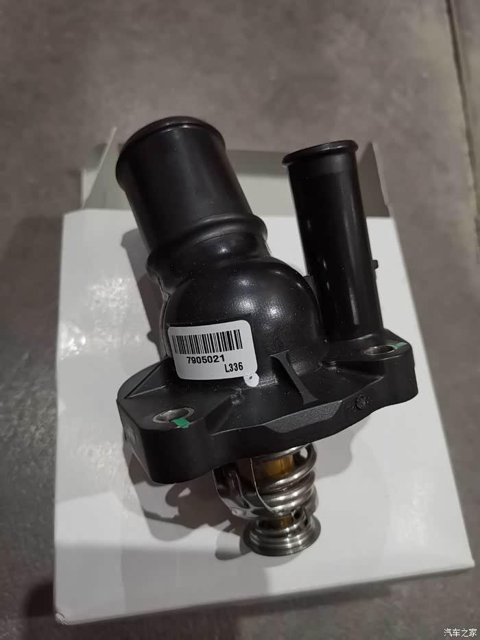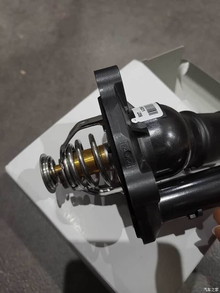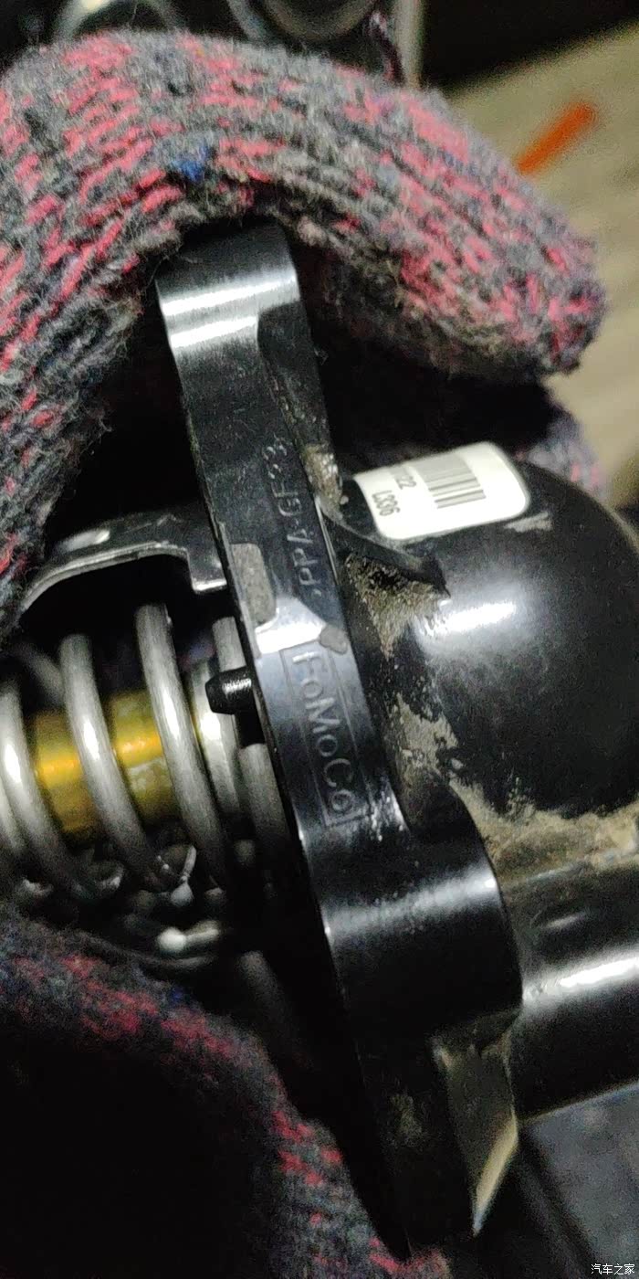 拆下来的原车节温器,和这次更换的细节有几处不一样,原车的没有日期标识,fomoco旁边的材质标新配件没有