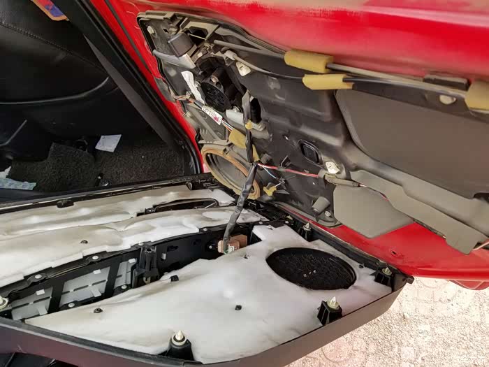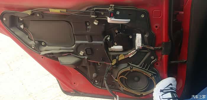 怎么拆的怎么装回去,看,完美支撑住,最后记得通电,遥控玻璃键提拉3秒以上,听到da~一声就搞定了,不然你主驾驶没办法控制后车窗了。改天有空搞四门隔音。~~~~~bye~~