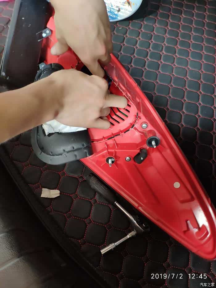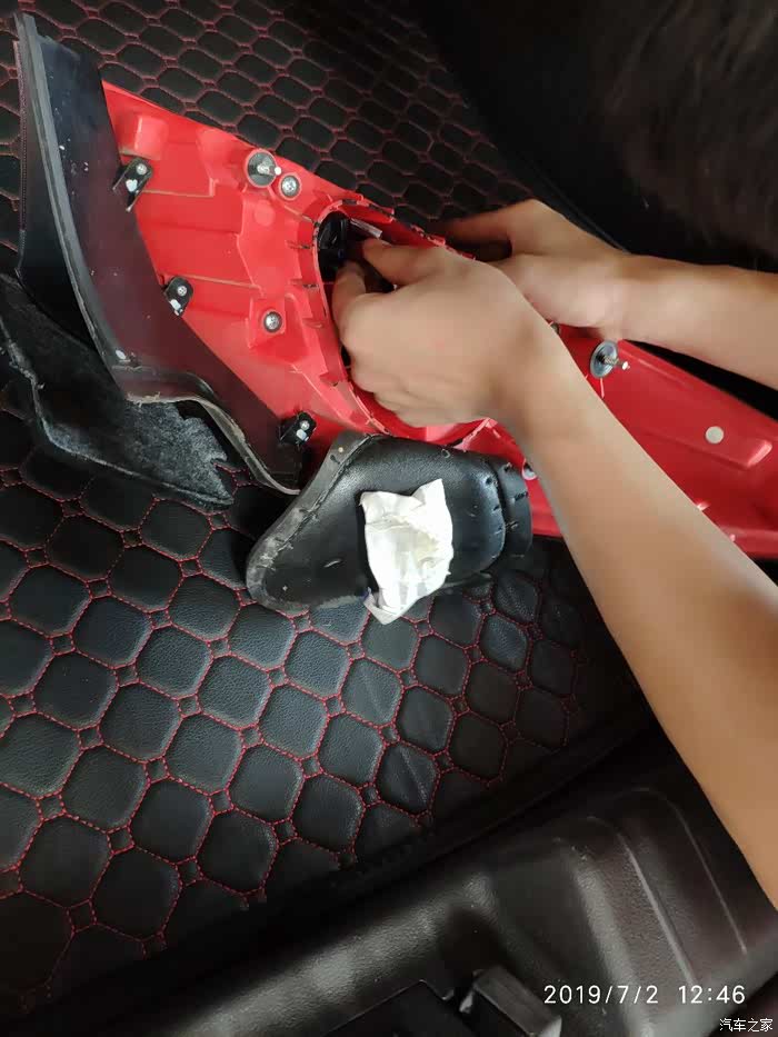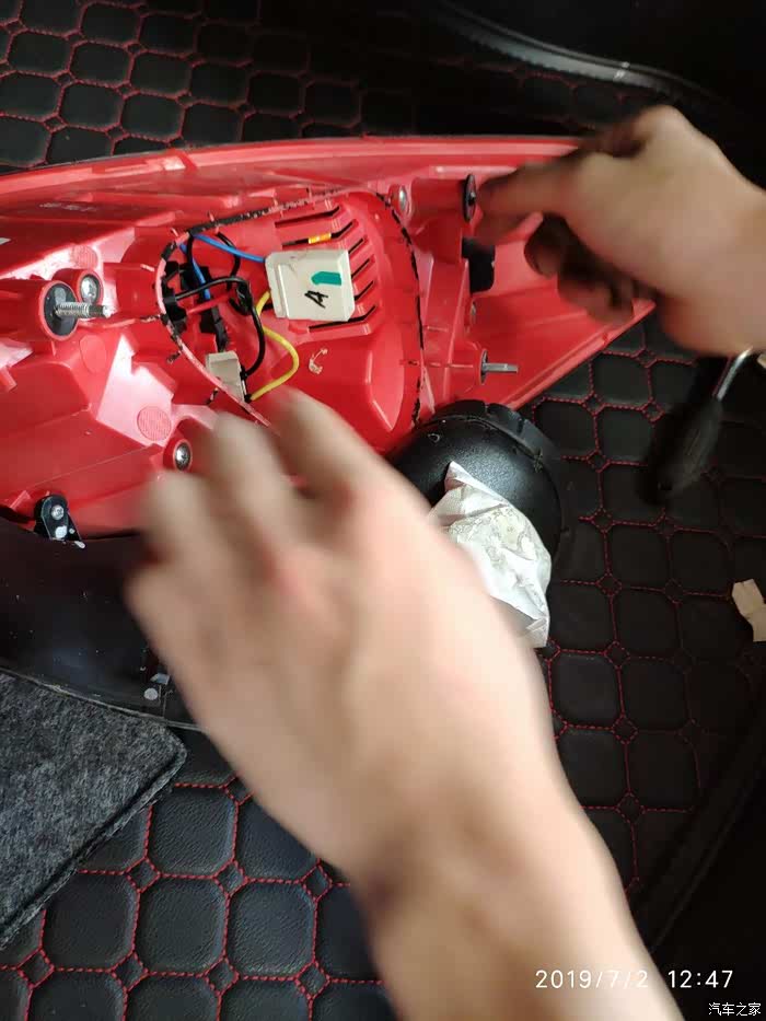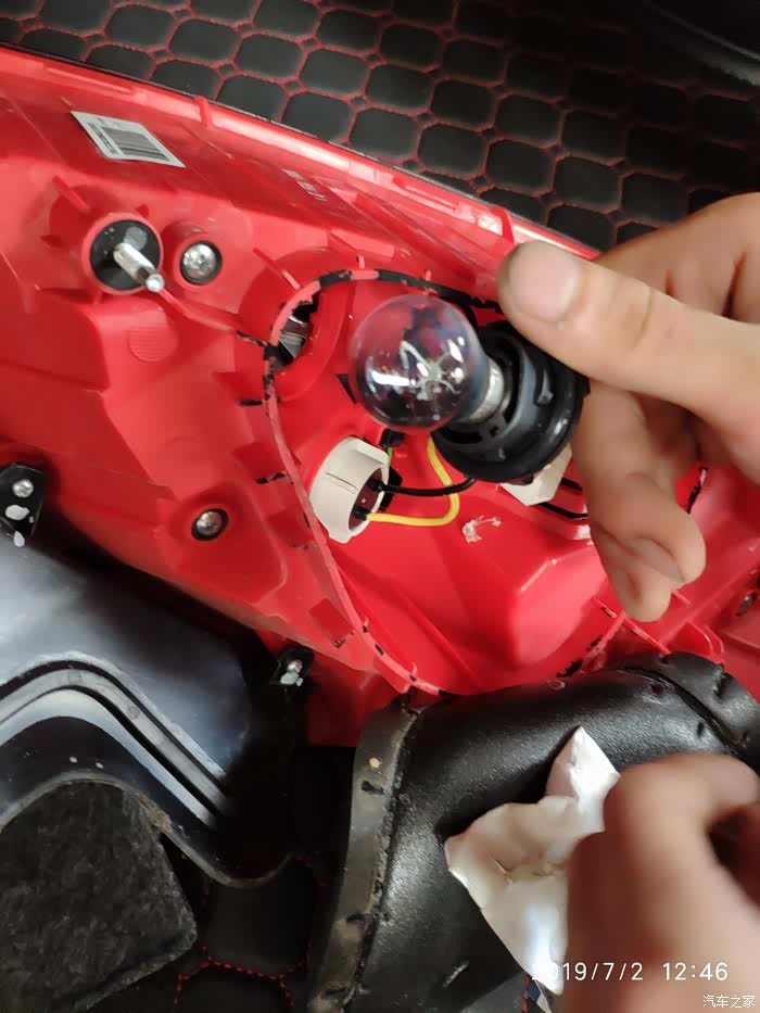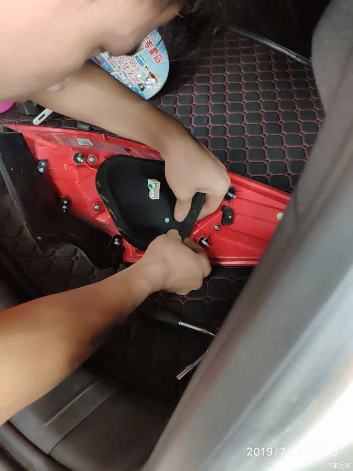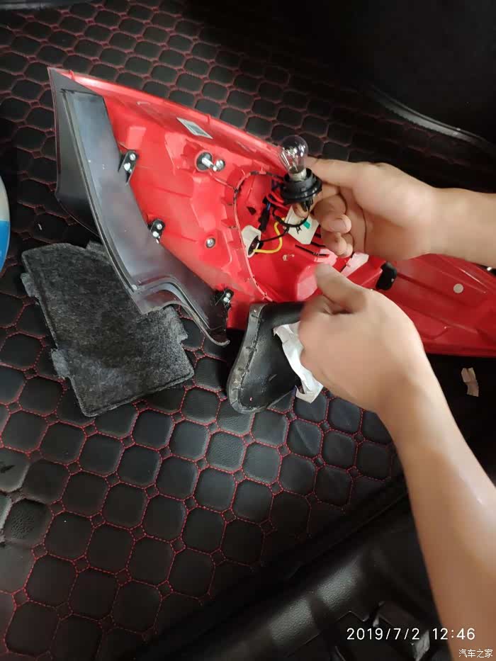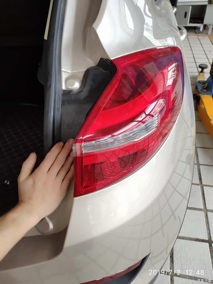 首先得先准备一个内六的板手,这个工具一般家庭也是没有的。打开车尾箱,在车里右侧有一块挡板,用手轻轻扳下来,这时会看到里面有三颗螺丝,就用刚才的工具把这三颗螺丝扭出来放好。把连接整个尾灯的电源插座接口取掉,从外部就可以把整个尾灯抱下来了。挡住尾灯接口的地方还包裹着一块粘性挺强的胶皮,4S店的小哥扯胶皮的时候小心翼翼的,如果是我自已换,估计会被我一整块拿掉,女汉子是这样的。翻开胶皮,尾灯的“小心脏”就暴露在眼前了,后面的事就简单很多,把灯泡拿出来换掉,之前的流程倒着再走一遍就OK了。亲爱的车友们,你们学会了吗?貌似我好像会了