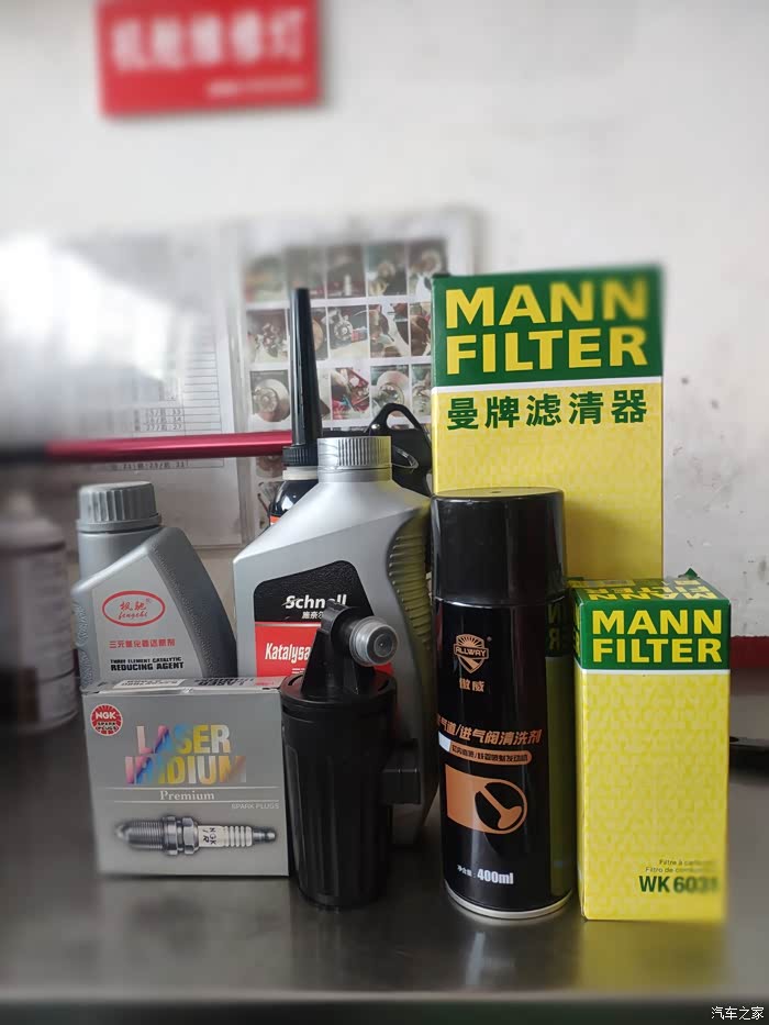 需保养更换材料:原厂空气格、曼牌空调格、曼牌汽油格、NGK铱金火花塞、原厂灰滤、傲威进气道清洗、施耐尔三元催化清洗套餐、喜门积碳清洗剂