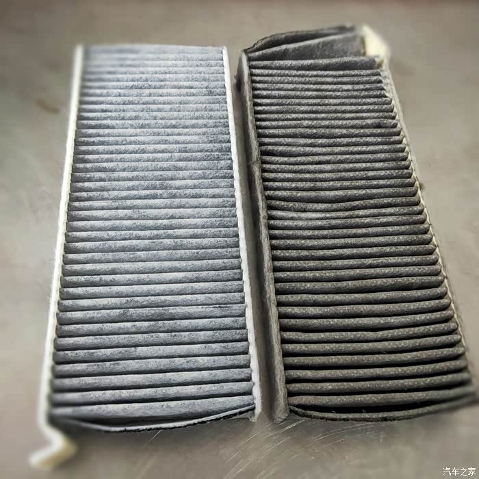新旧空调格对比,明显看出原车的很脏 , 一般建议间隔15000km左右检查更换。