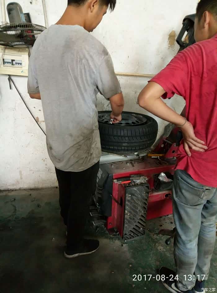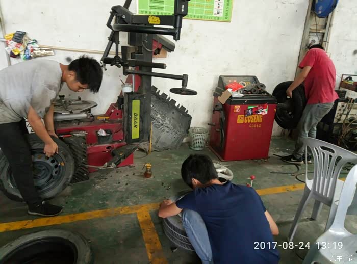 三位小哥的辛勤付出(一个更换旧胎,一个试水看是否漏气,一个做动平衡)