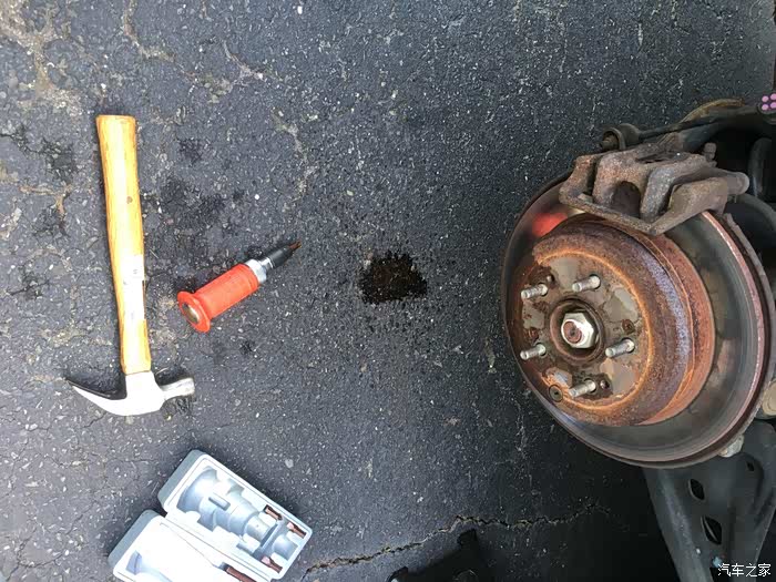 之前给讴歌TSX换刹车盘的时候就遇到过,用冲击螺丝刀和锤子敲了半天,弄不下来,只好把螺丝用电钻给钻掉了。这次依然先尝试冲击螺丝刀和锤子敲,运气不错,终于拧下来了。