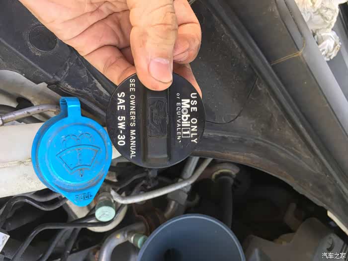 机油盖子上还写得Use only mobil 1 (只能用美孚机油)下面跟了一行 or zequivalent。(或者同类产品)