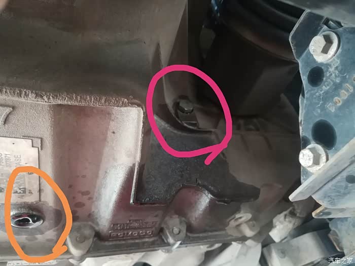 画黄圈的地方是变速箱底部放油螺丝口,流旧油的地方是观察口