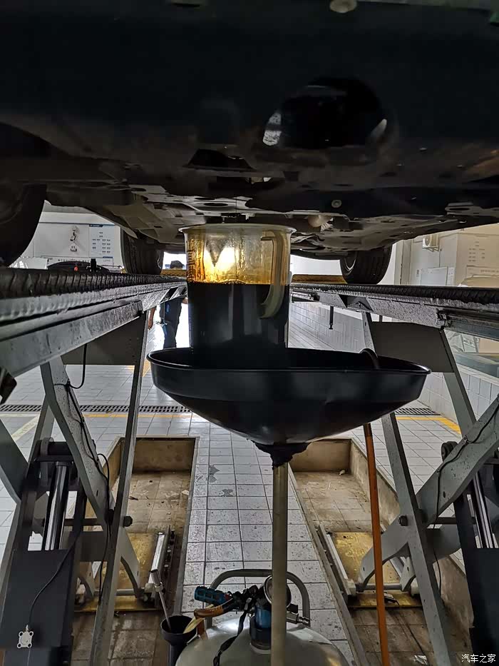 还没有拆除机油格,放出3.9升机油。拆除机油格后,从机油格倒出200毫升机油,总共放出机油4.1升。
