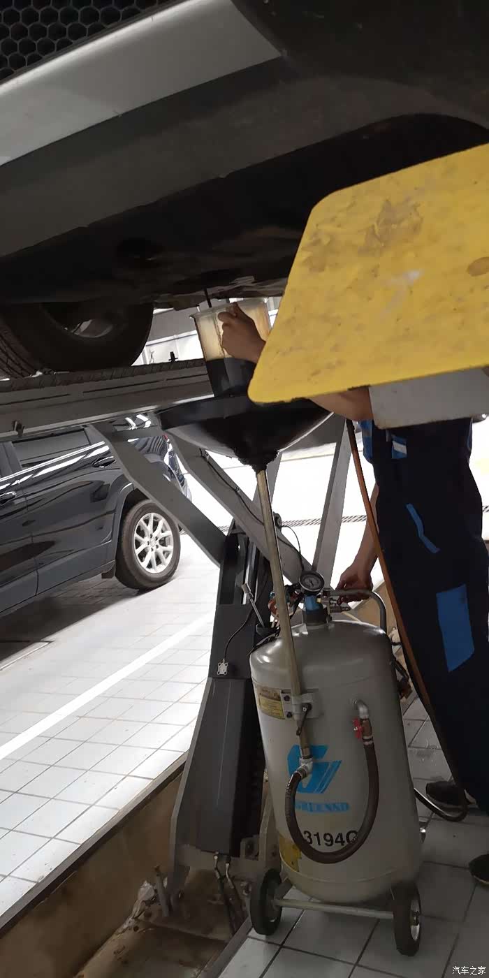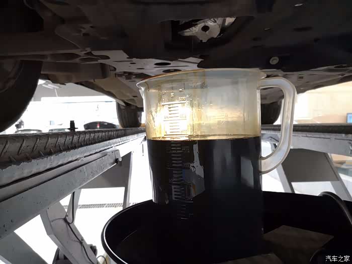 准备放出机油时对4S店的师傅说要测量机油量,师傅拿出量杯接放出的机油。
