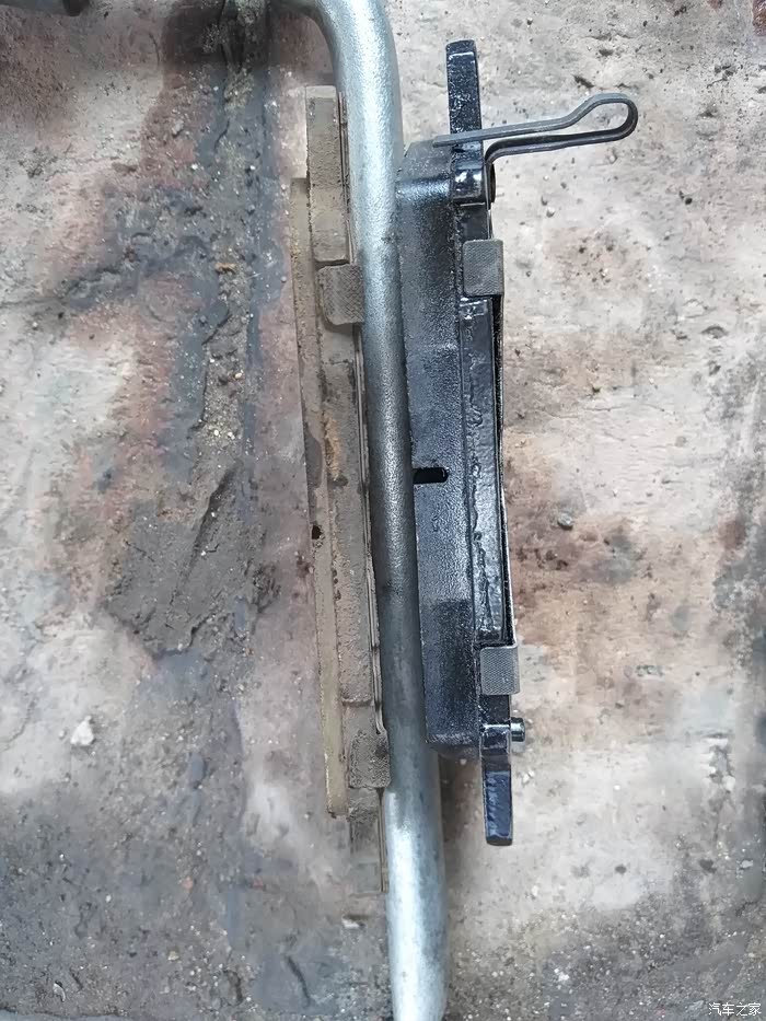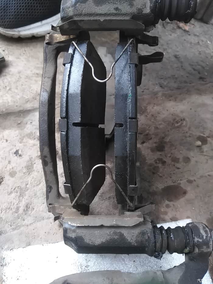 装上新的刹车片,卡子也上好,技巧就是先上好一面的固定销,然后转动,到位后再把另一个固定销也上好。