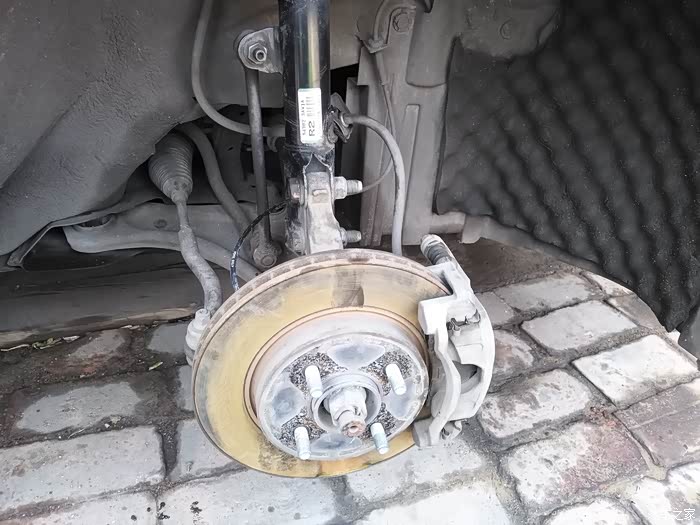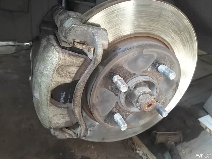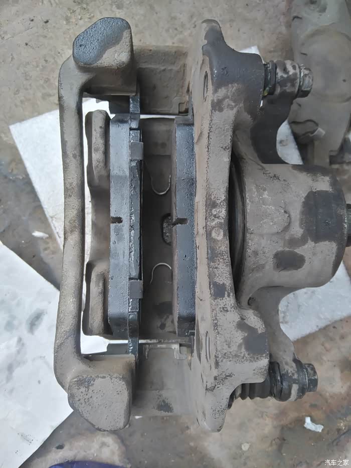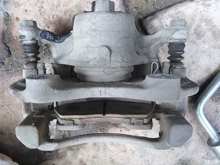 分泵总成装回刹车盘,因为是新刹车片,有点紧,不太好装,慢慢用锤子敲就行了。