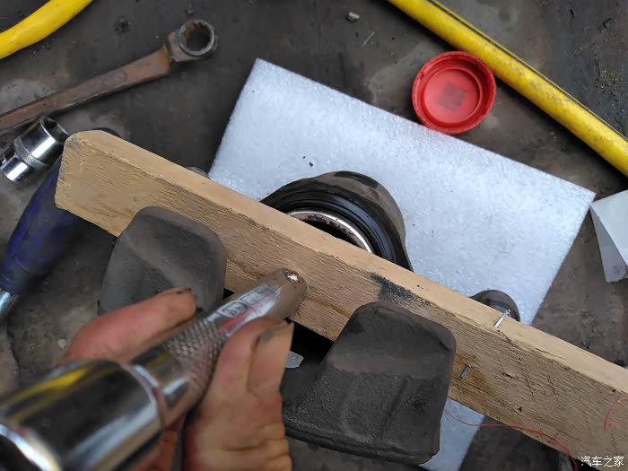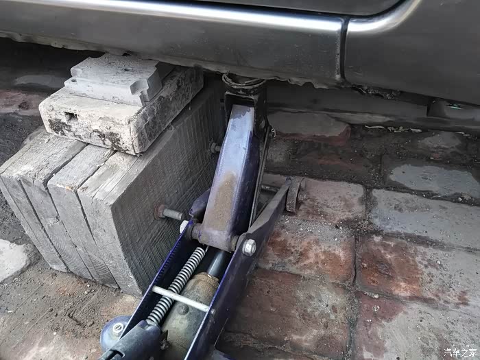 千斤顶起车身后,用木头垫住,因为要钻车下拧螺丝,这步马虎不得。