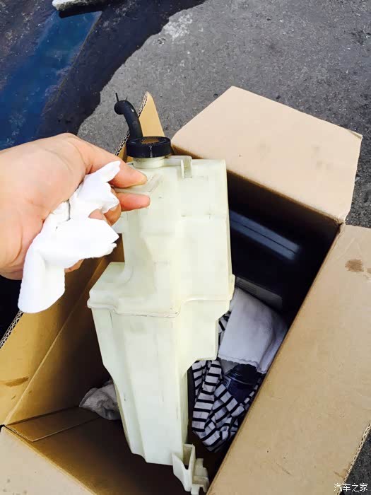 将副水壶的管子拔掉,用力晃几下旧防冻液,这样可以清洗一下桶,然后倒掉。