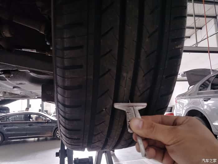 量一下轮胎磨损程度。