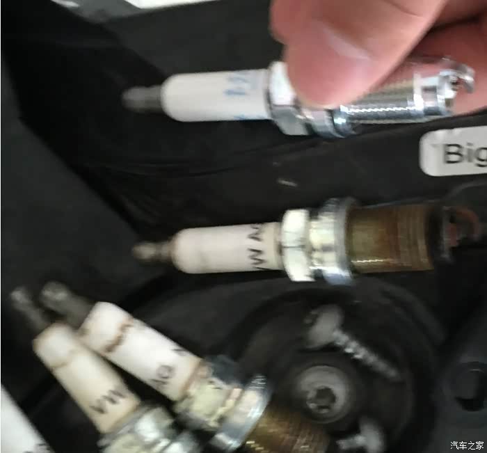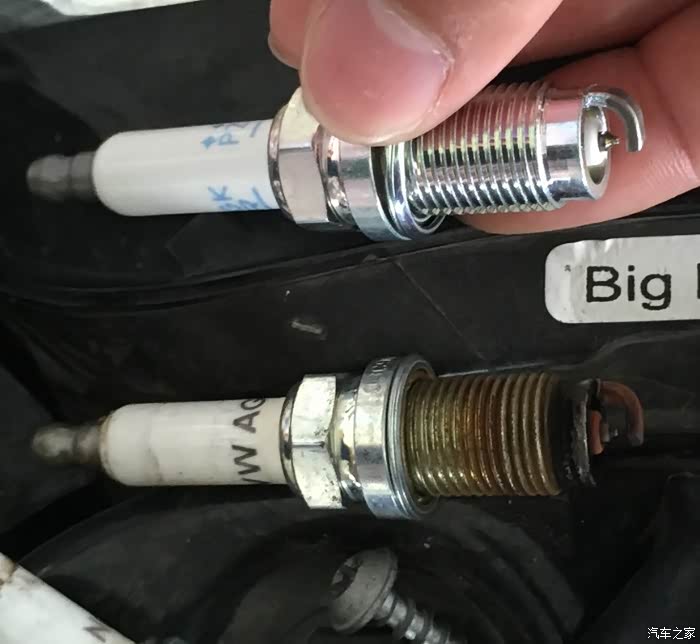 能这样新旧对比,我是不敢拿旧的,好烫。表示看不懂有啥区别,字体不一样颜色,旧的黑色,新的蓝色。把新火花塞放进去没拍照,很简单。我在一旁擦节气门罩呢