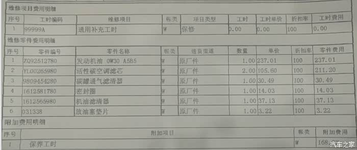 购车6个月,行驶里程3000公里,因为车一启动就提示需要保养,加上4s店服务积极,提示及时保养,说如果“超过规定时间或7500公里数后,将需要自行承担首保费用并会影响车辆质保”,且担心网传的休息日法方服务器可能不工作,就在上班日进行了首保。 一是更换机油、机油滤、放油塞垫片和机油滤清器。这个是常规的首保更换项目,其余的都是检查项目。二是ESP升级。厂家优化了行驶稳定系统,需要升级。三是压缩机固定检查。对可能的压缩机固定螺栓隐患进行强化。四是更换中控三个小装饰板。可能的小瑕疵,进行改良操作。