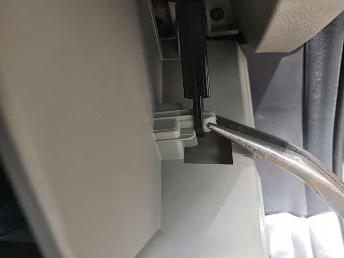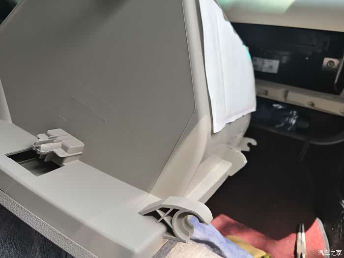 解除扶手箱的挂钩,就可以拆下扶手箱。