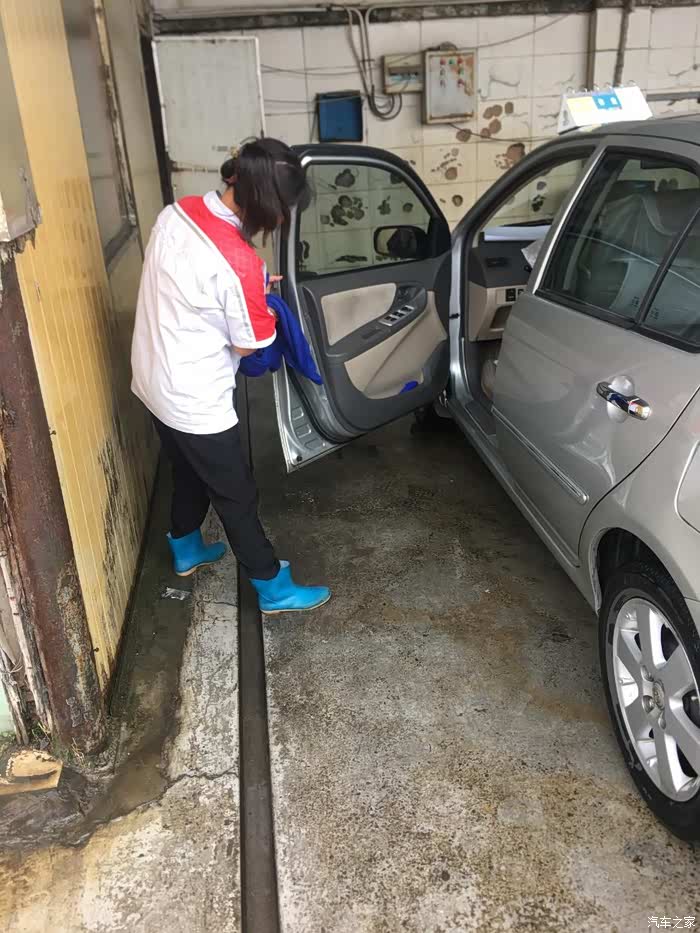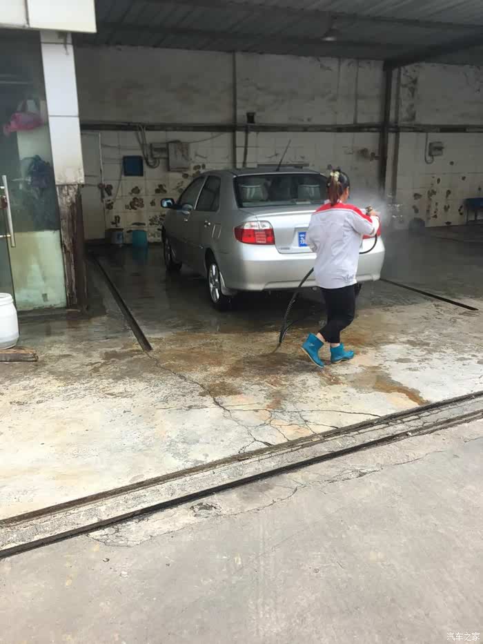 洗车场,阿姨用水枪冲洗一下车辆外观,跟随我们一路奔波10年,给小威洗个澡。