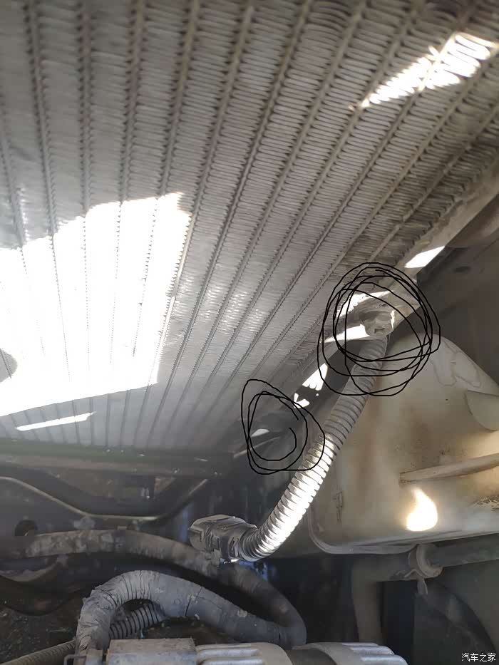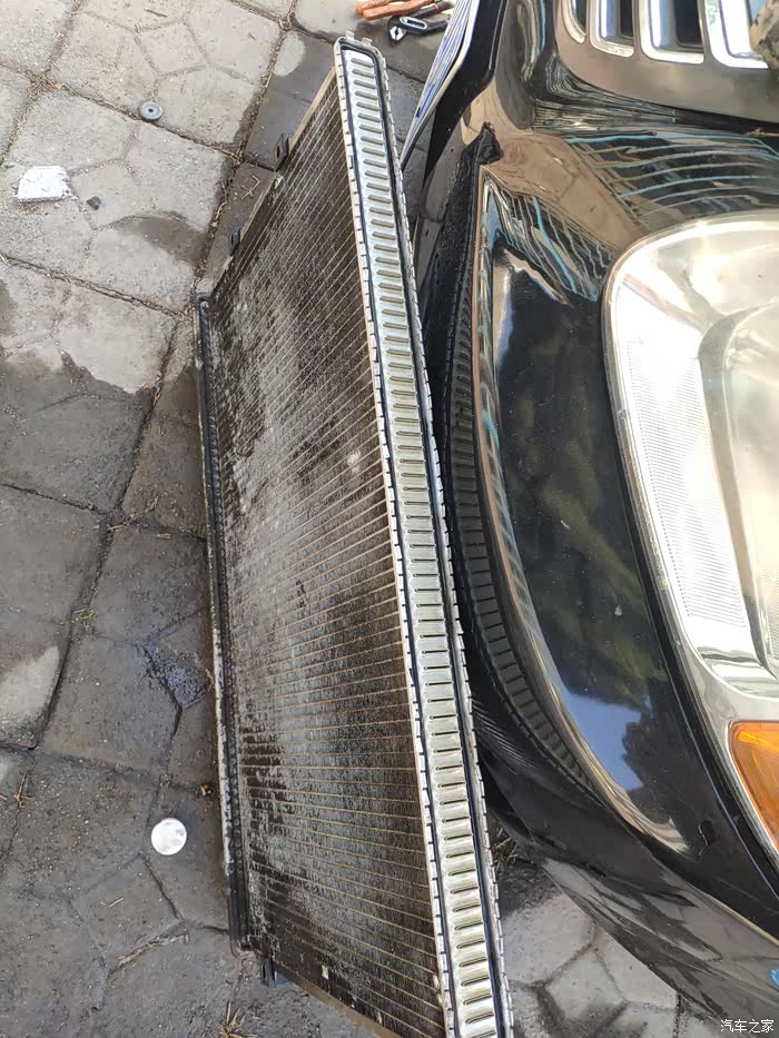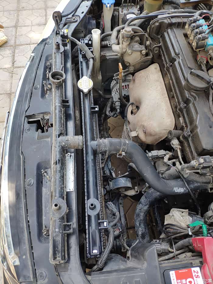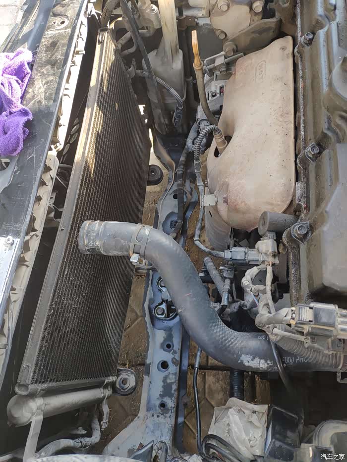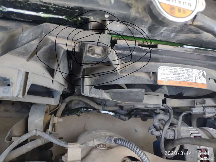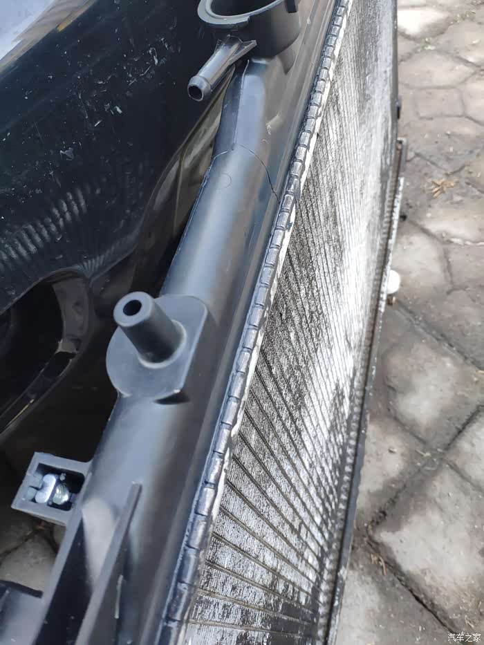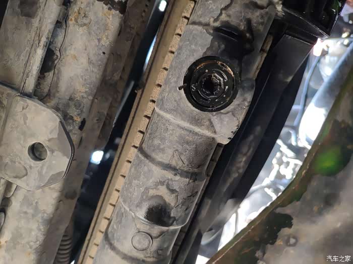 第二步:风扇拿掉后就看到这个螺丝了,这是左边,上下两个,这个螺丝是把水箱和空调冷凝器连接在一起的,需要拆掉。