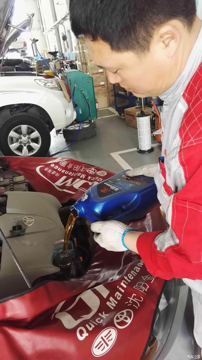 保养师傅往小威里倒入新机油。