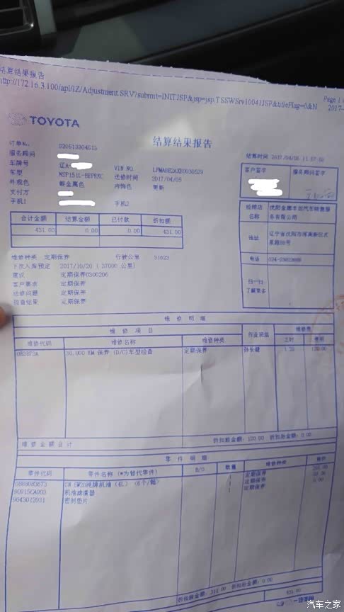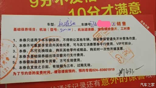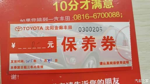 这个券是我2015年3月30日做二保时买的,当时4S店有活动,买三赠一,每张券是431块钱,包括一次常规保养的全部内容,机油、机滤、工时费、机油垫片,这样折合每次常规保养不到400块钱,比较划算。这次是最后一张,4S店也没有这种打折力度很大的活动了。