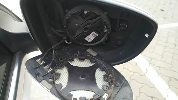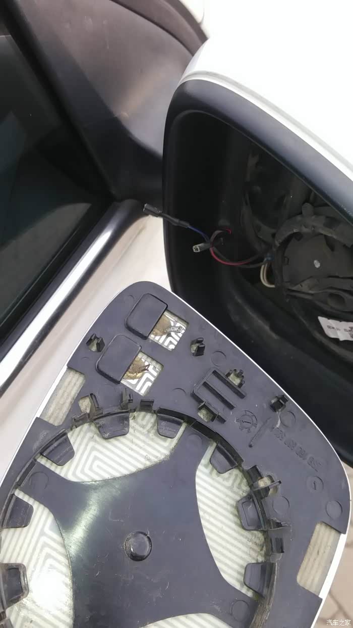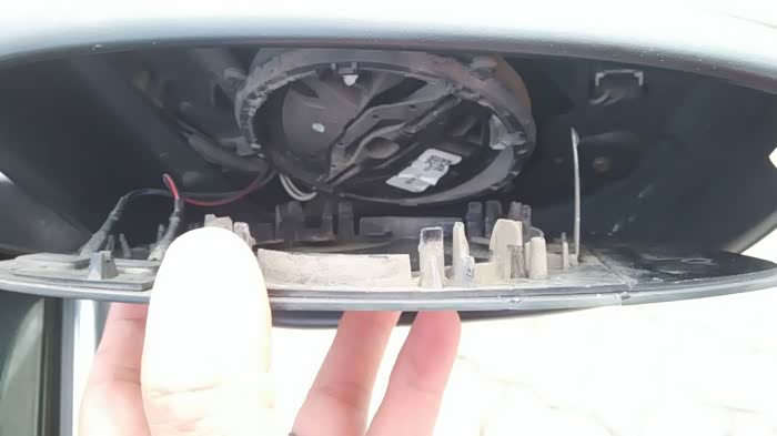 先使用电调节,将后视镜角度开到最大,露出最上边缘的缝隙,也得用手省劲掰,能看到里面的结构,毕竟是破损的,也不心疼了!