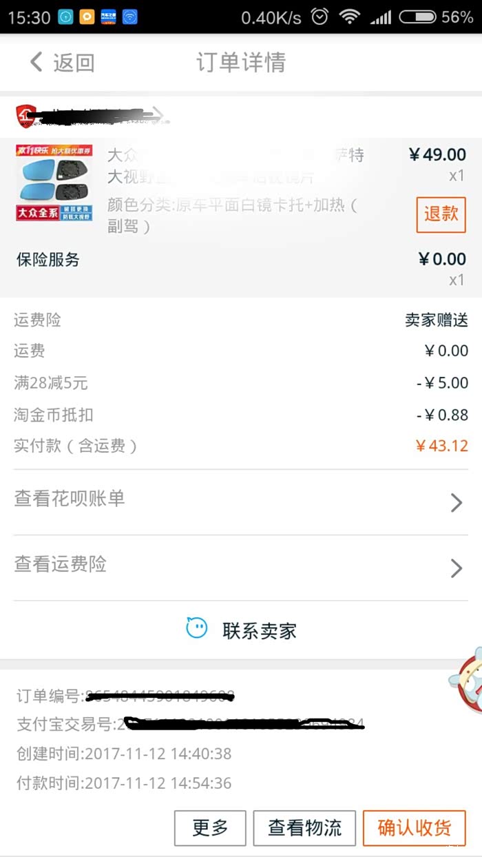 网购右侧后视镜,原价49元,抵扣后实际付款43元!(偷偷告诉你,用一淘拍,还给你返7元呦!)