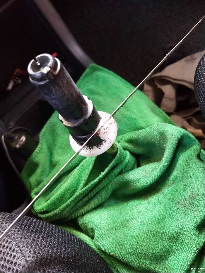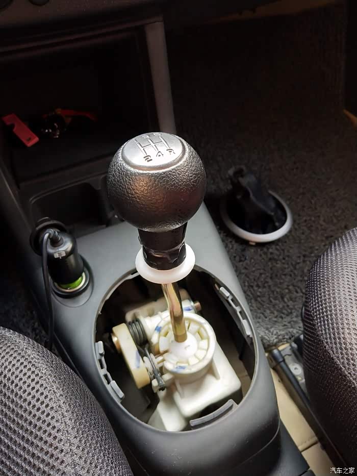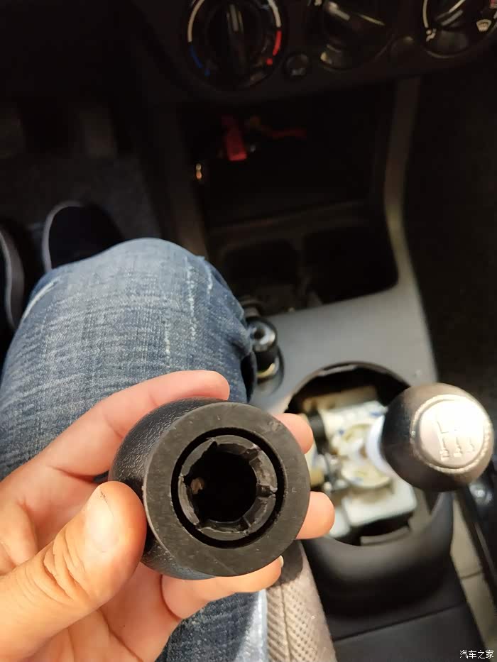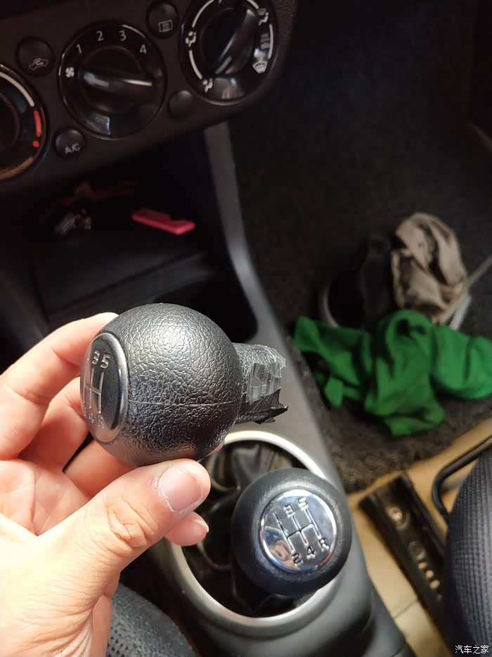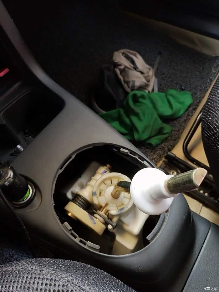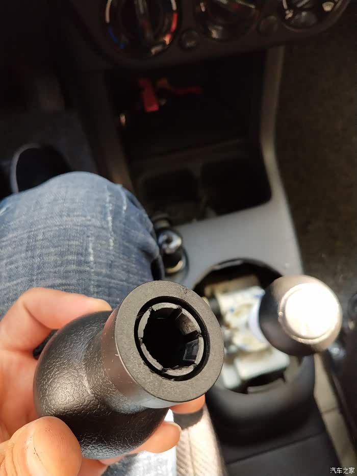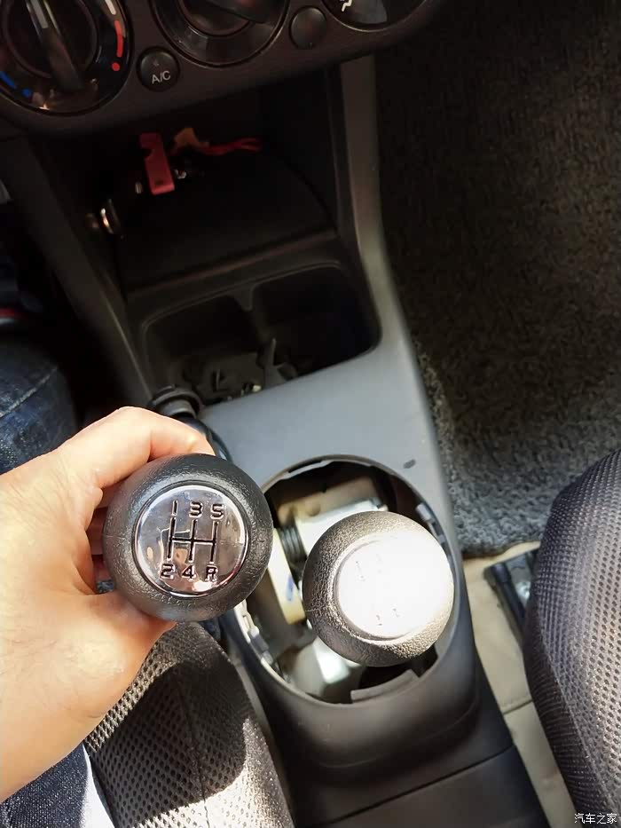 拿掉手球露出黑色底壳,卡扣在白色底座上的。很费劲只好用锯条一点点锯开。千万别把白色底座弄坏了。否则安装不上新的手球。垫上毛巾,防止碎屑掉进档位里。