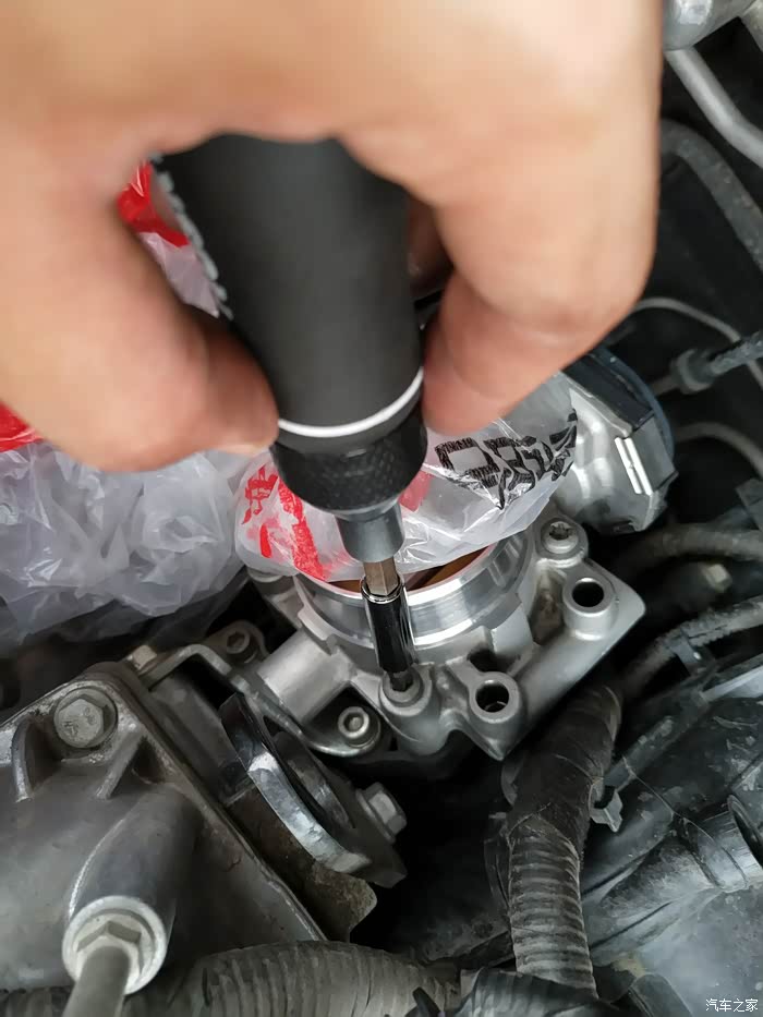 用东西盖住节气门避免东西掉进去,然后用T25内六角拆节气门四周的四个螺丝。