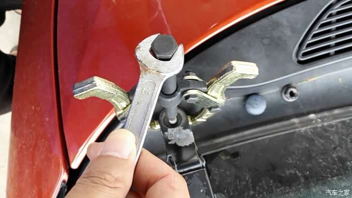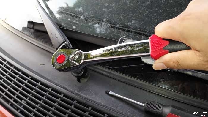 先拆掉左右雨刮臂固定螺帽外面的装饰件,用一字起很容易就可以取下。然后用套筒扳手拆除左右雨刮臂固定螺帽。