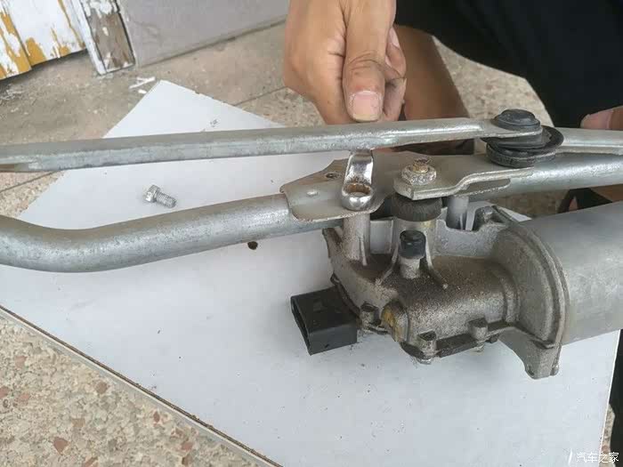 先拔掉和雨刮电机连接的电路接插件,拆除支架固定螺丝,即可取下雨刮连杆总成。