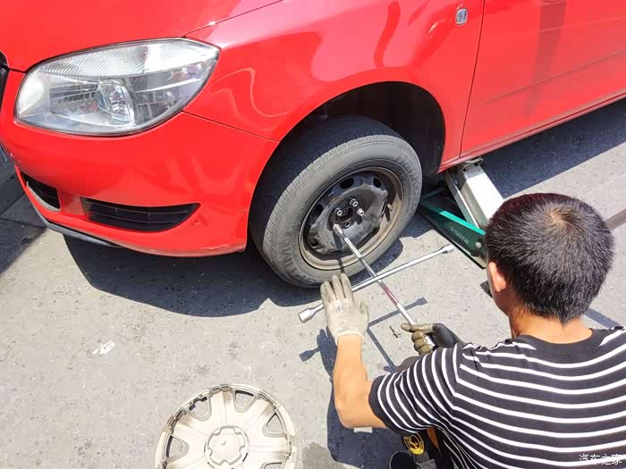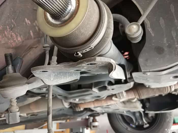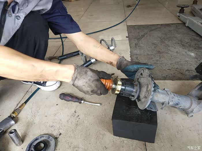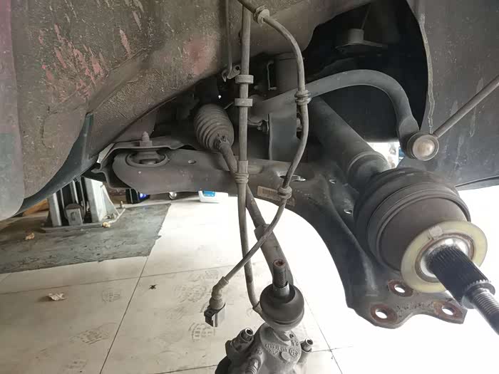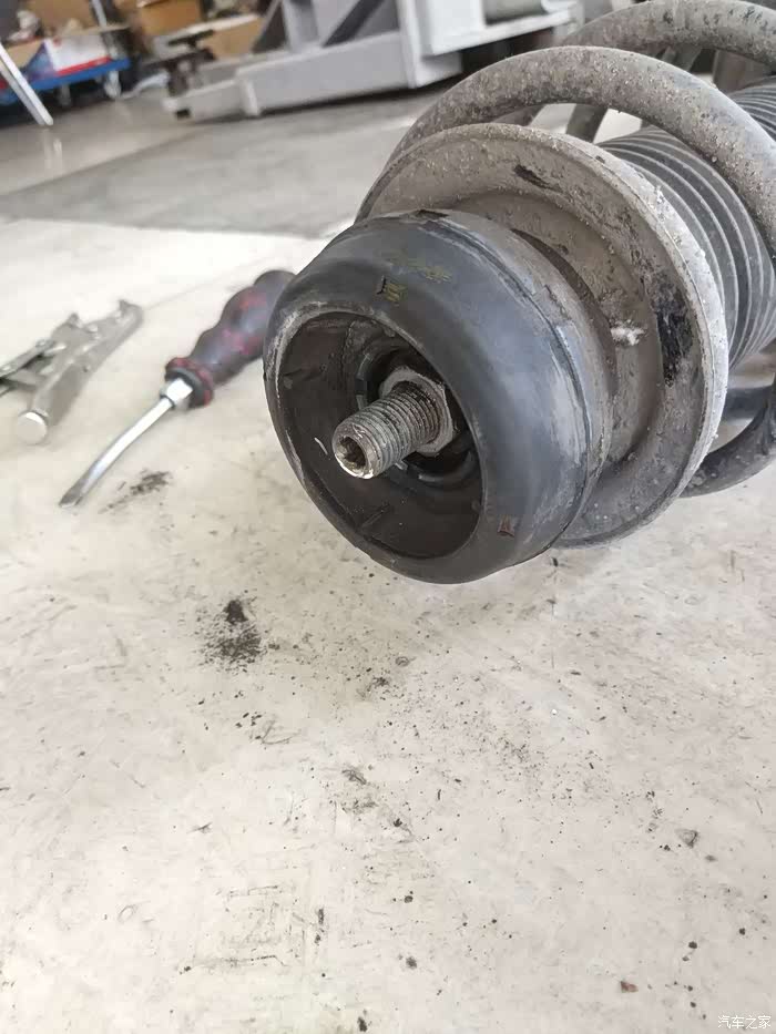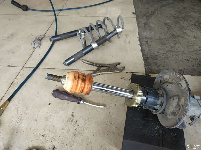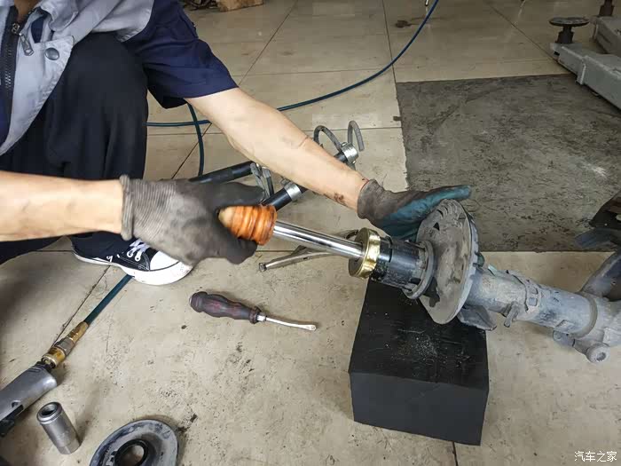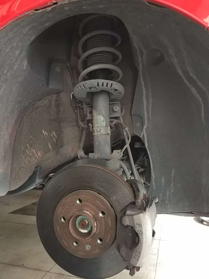 小师傅让左右来回打方向,确认是平面轴承问题导致打方向发出的响声之后,三下五除二就卸下了车轮,准备拆卸前悬挂的减震器(这么说规范么,望大虾指点)